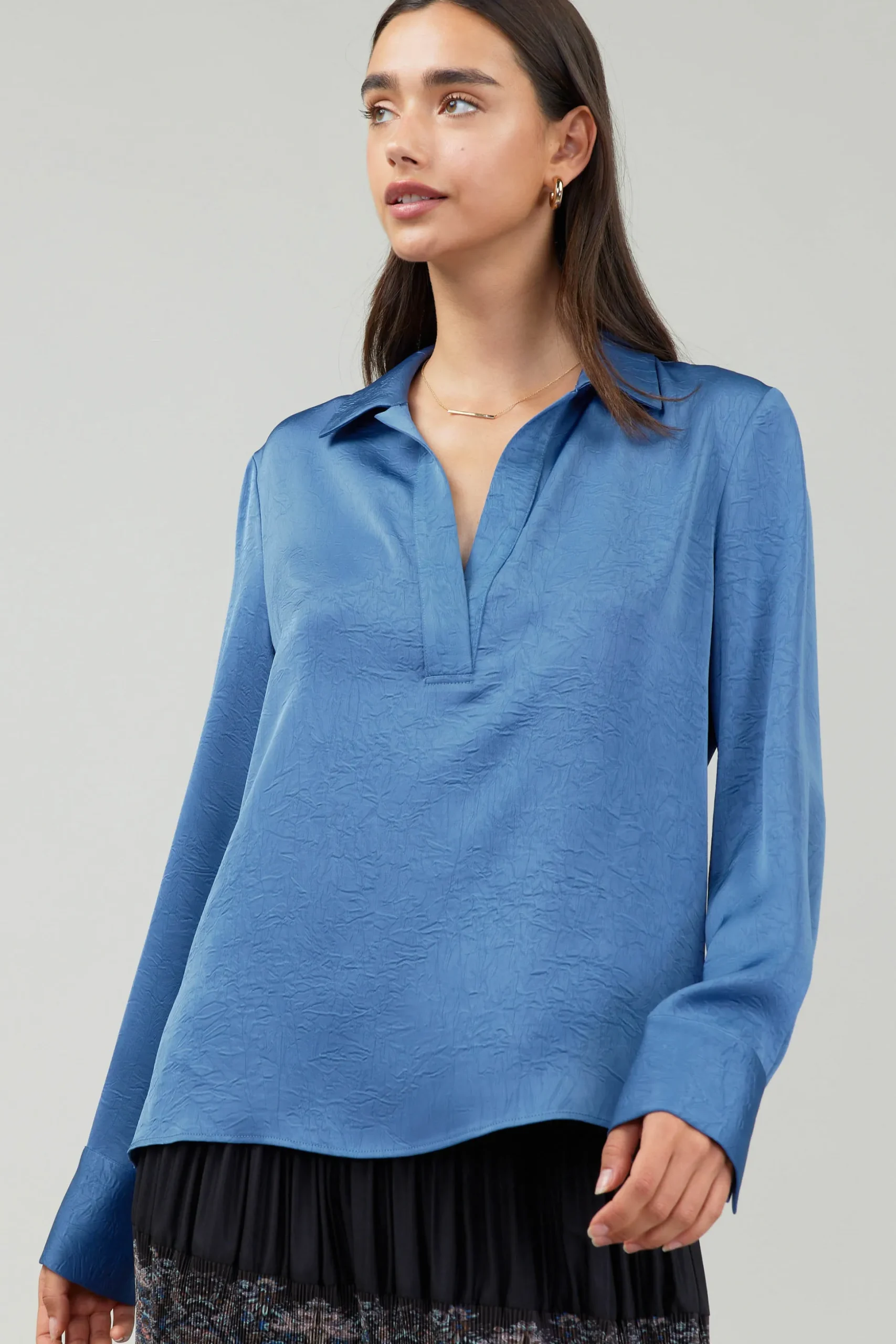 Lightweight this gently crinkled top makes any ensemble shine. The Johnny collar and side slits add a laid-back feel, so it can be dressed up or down with ease.