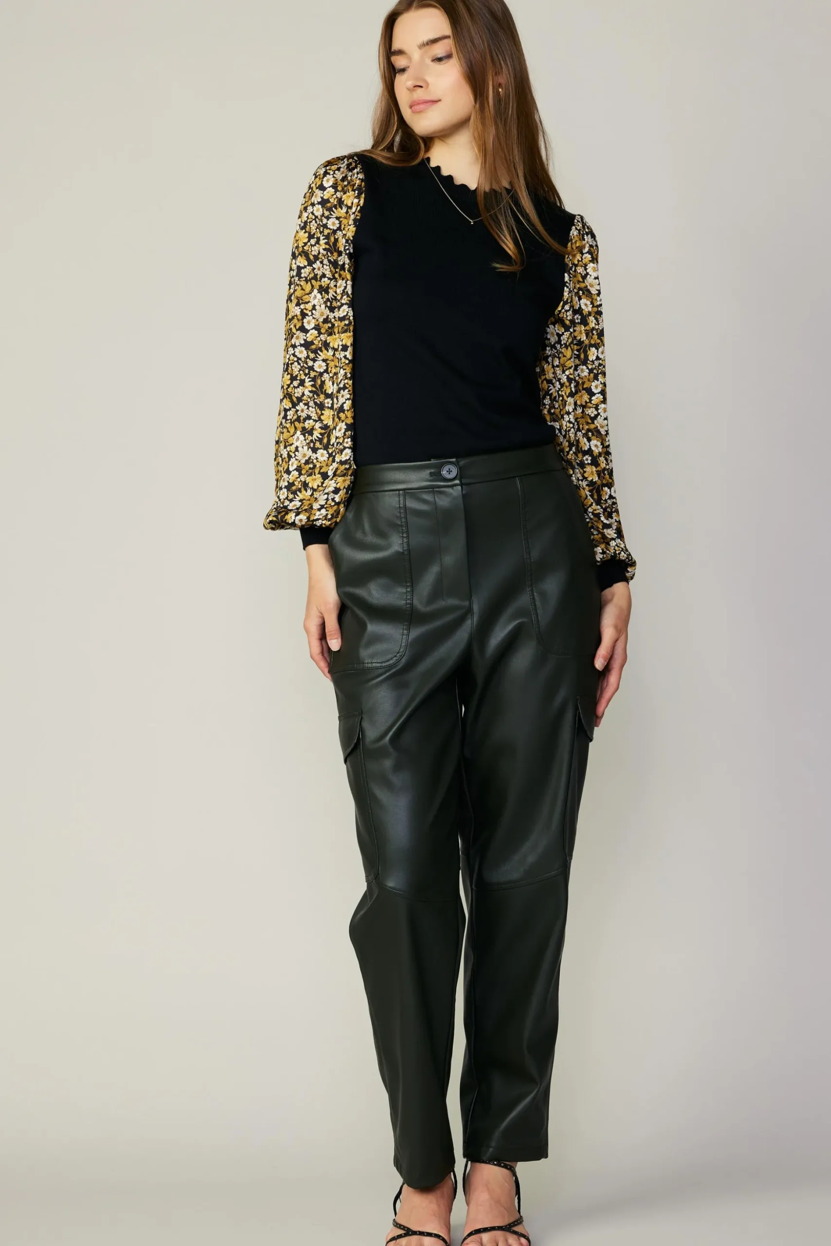 This isn’t your typical sweater. The bodice is knitted with a scalloped neckline and ribbed edges. It’s contrasted by long, woven sleeves with a slightly puffed shape and a charming floral print on a black base.