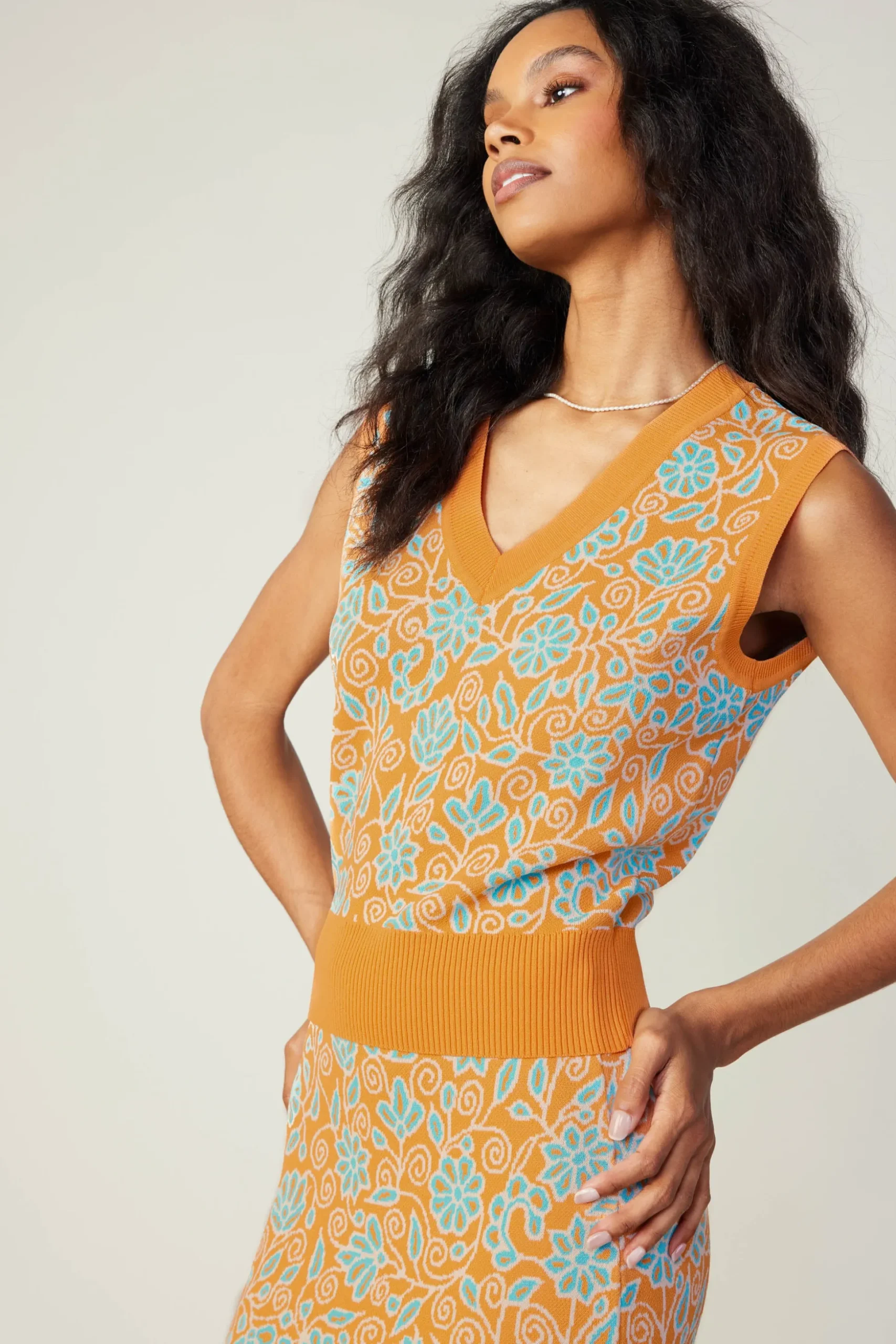 A fresh pick for your knitwear collection. This sweater vest is intarsia-knitted with a charming floral print. A deep V-neckline flatters the sleeveless silhouette. Ribbed edges add a touch of texture.