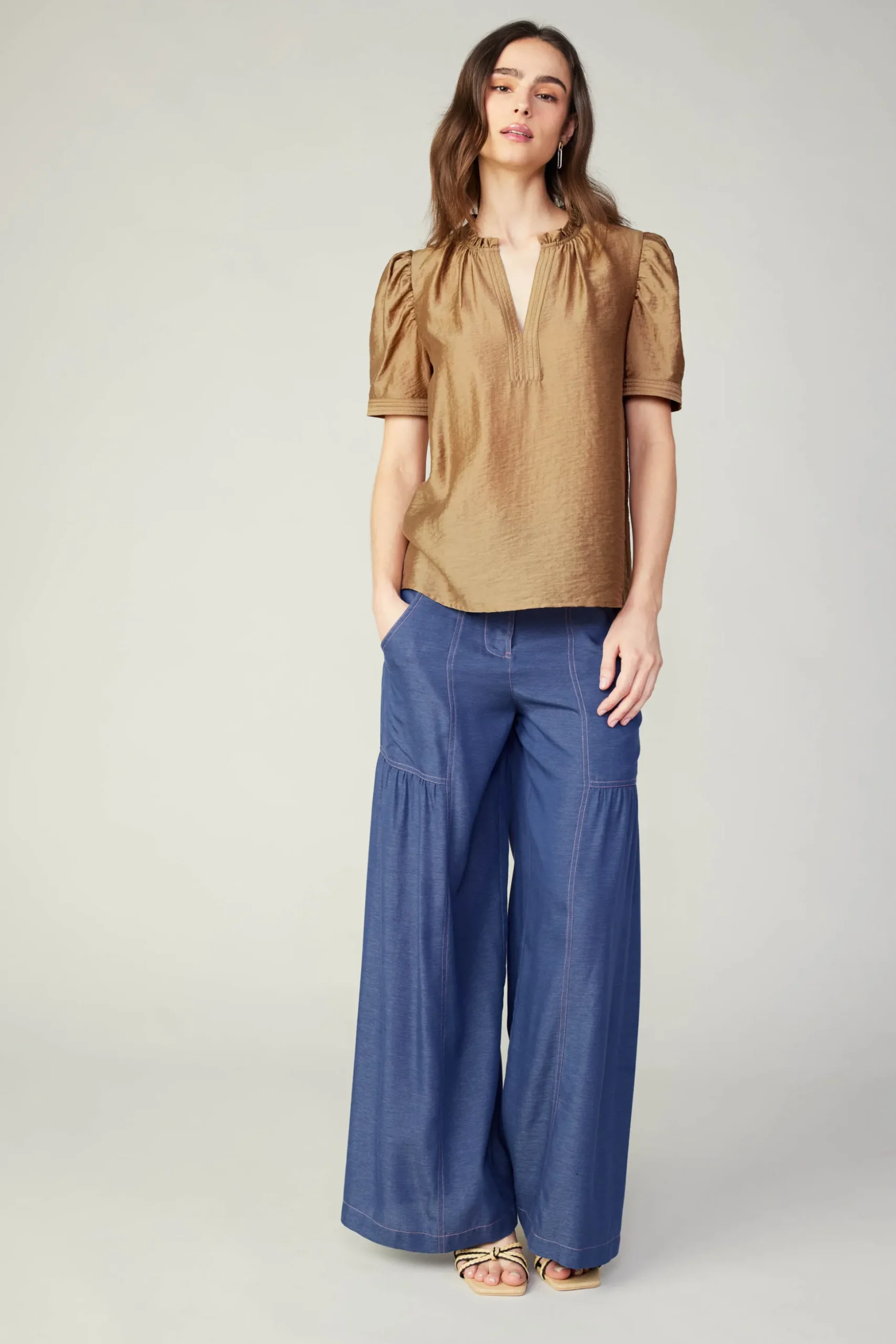 This airy blouse is designed with an appreciation for detail — note the subtle gathers, delicate ruffling, and the stitched trim that accents the neckline and cuffs. Lightweight with a subtly luminous sheen, it’s made from woven fabric floats against the figure in a relaxed shape.