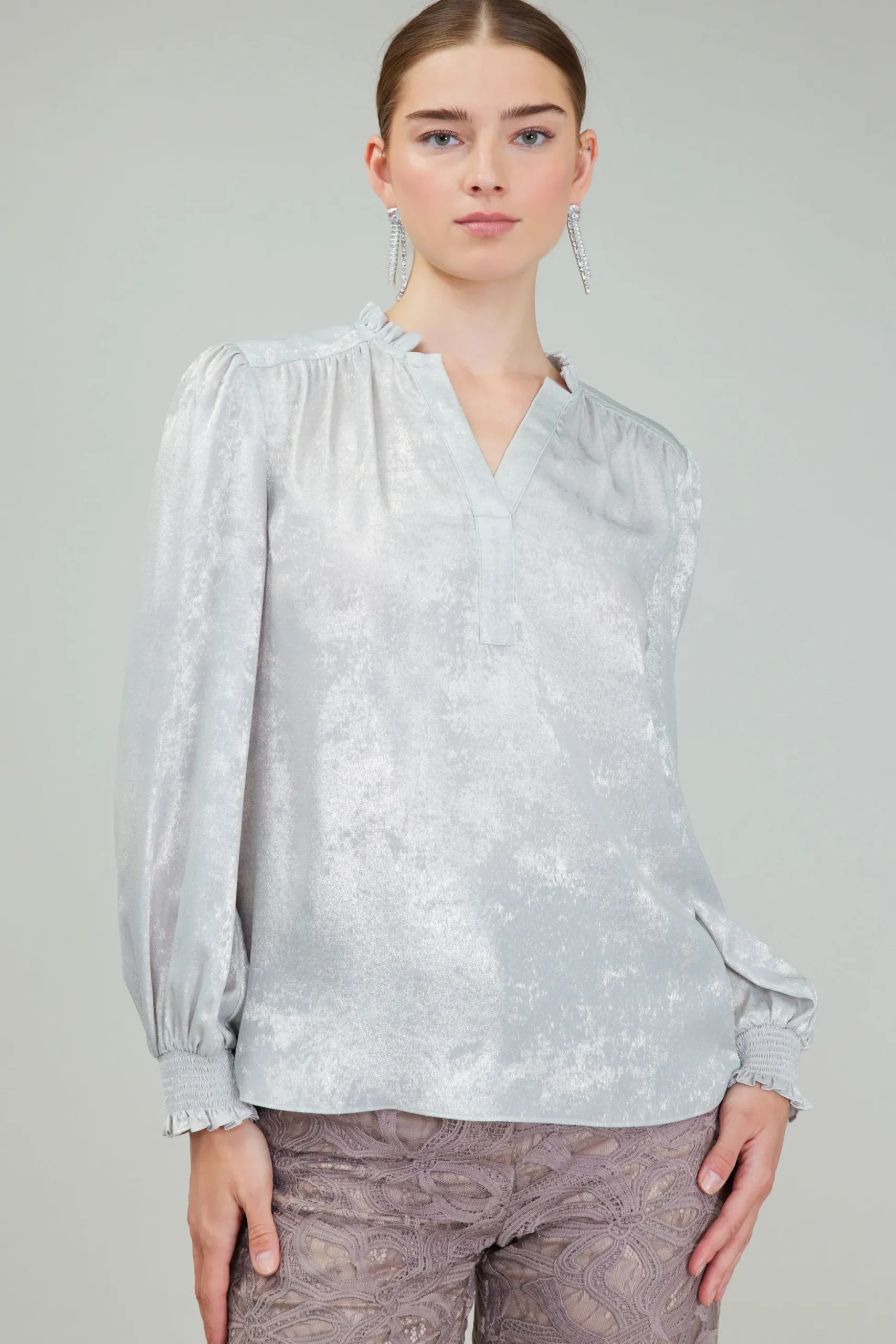 This split-neck blouse features a breezy fit in a pale-grey oyster hue with a lustrous sheen. Ruffled around the neckline, it’s got gathered detailing and gently puffed sleeves cinched by smocked cuffs.