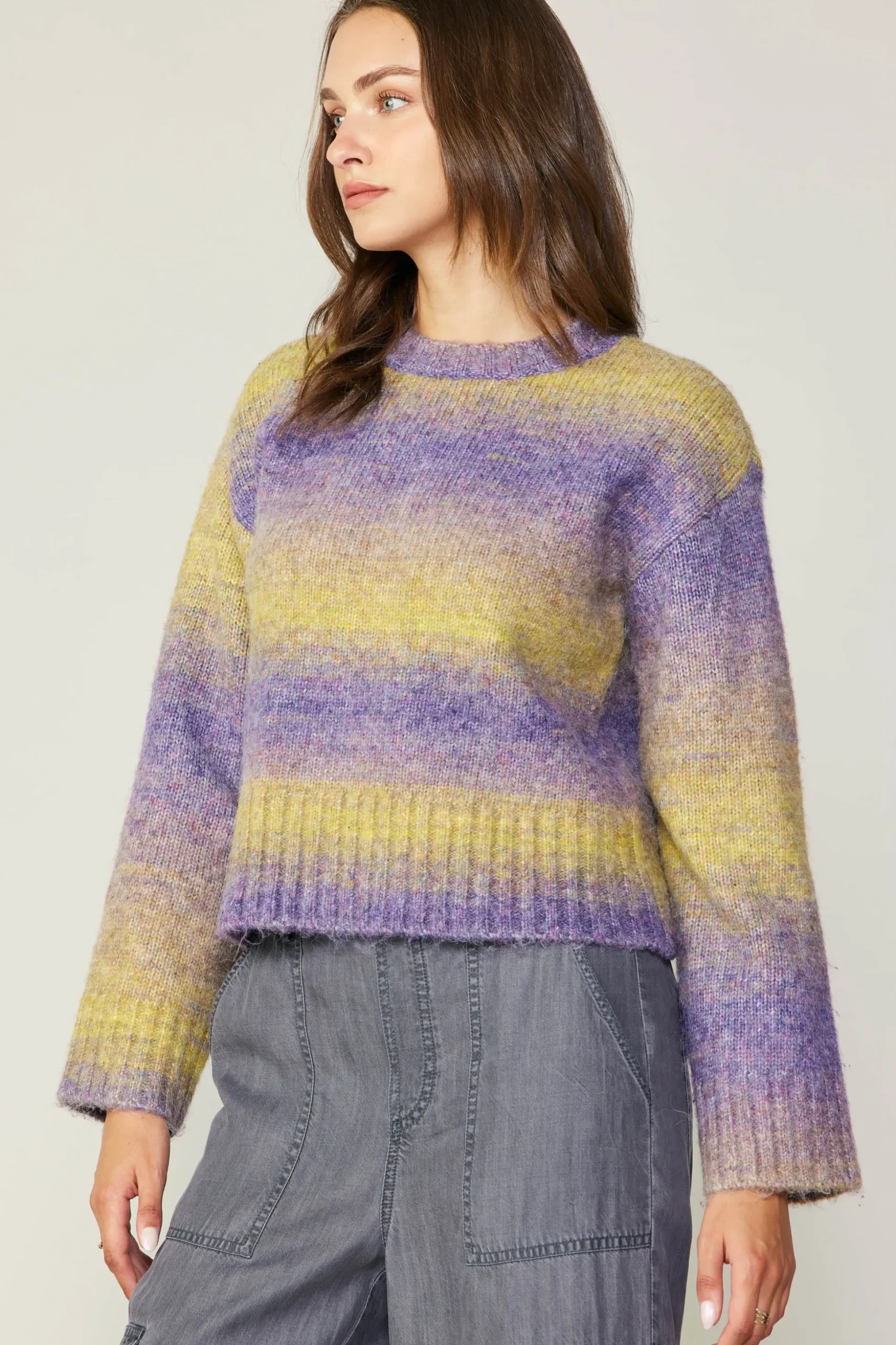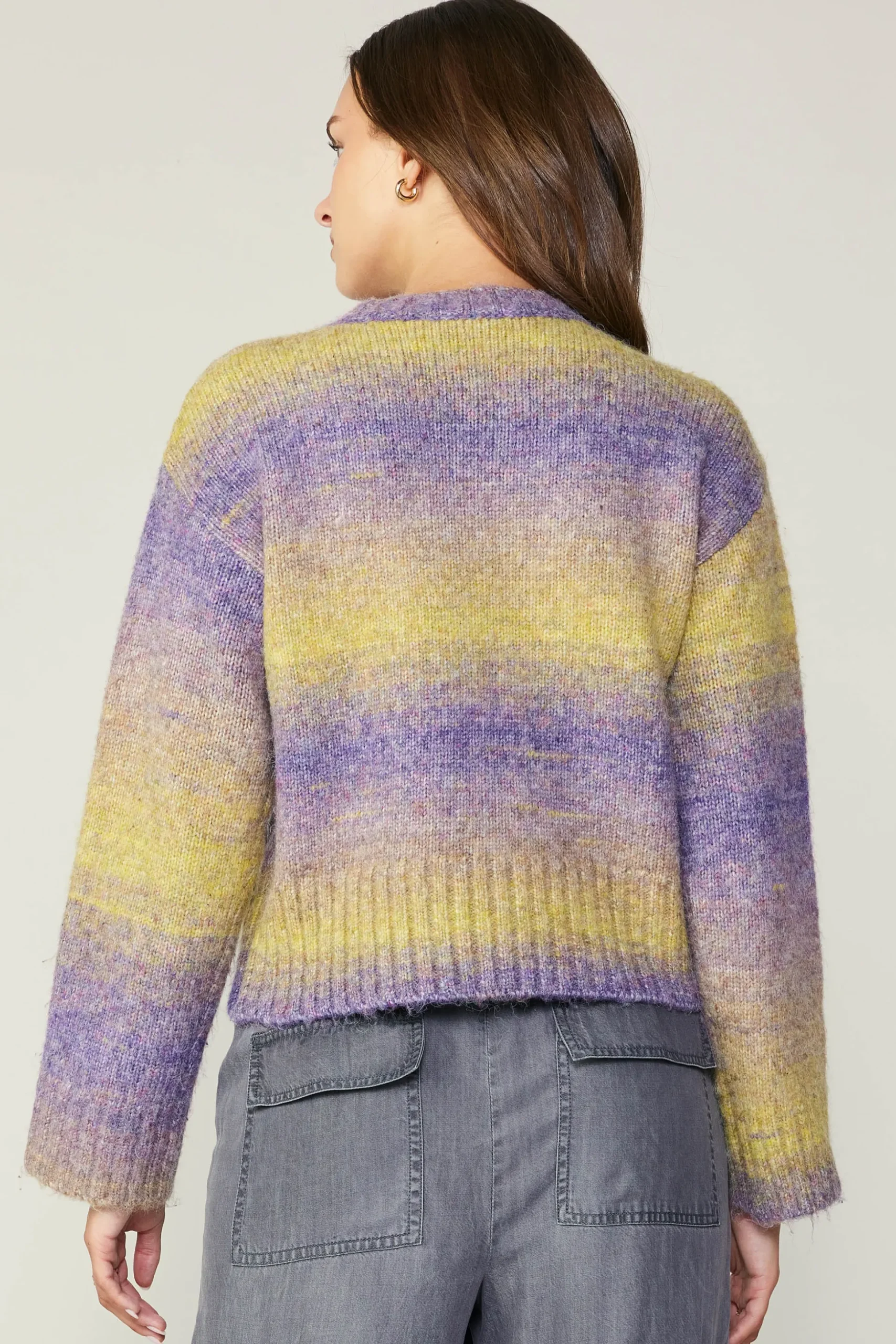 A beautifully done, gradient shading is the star of the show with this cozy sweater. It features ribbed edges for a comfortable fit and subtle detail. Perfect for transitioning into the fall season.