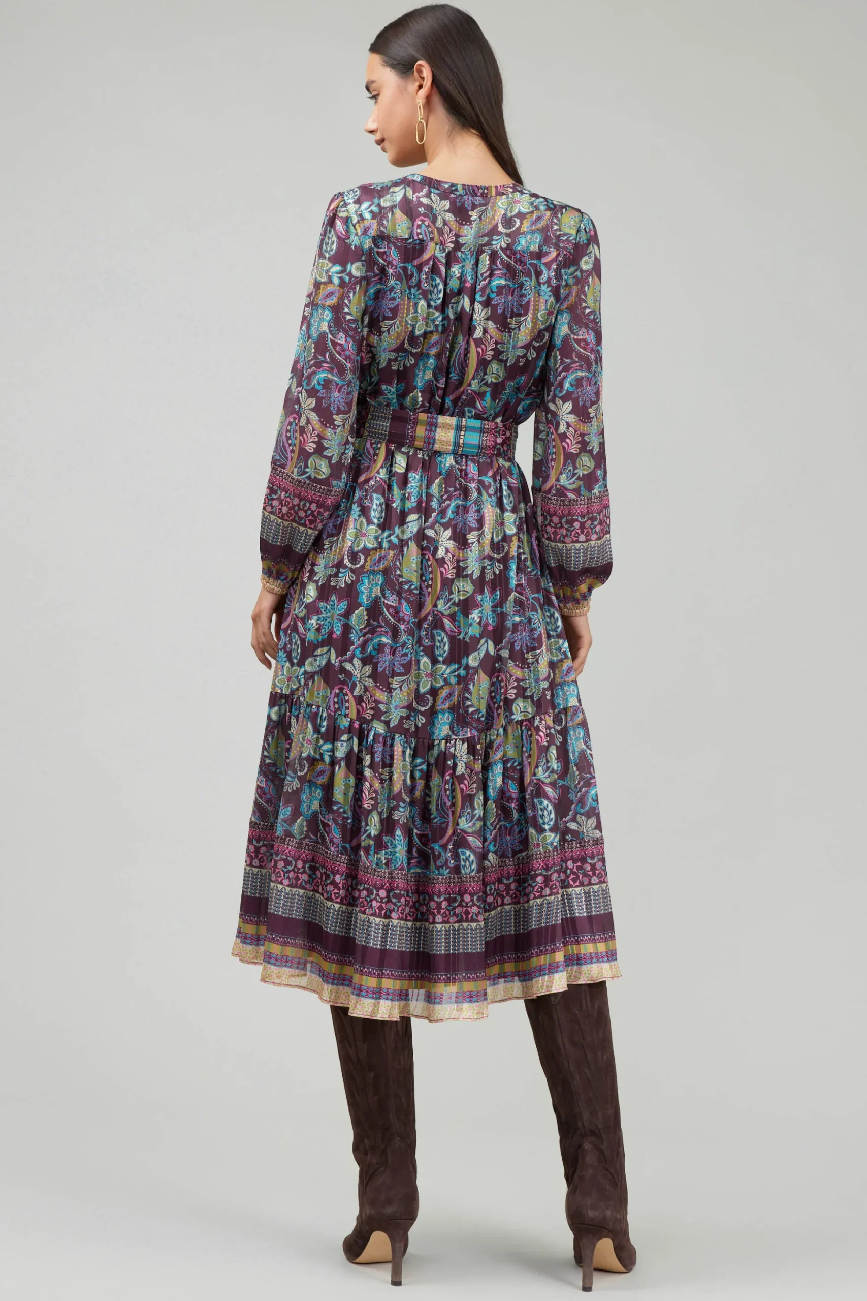 A fresh floral-print dress, accented by an ornate border motif encircling the cuffs and hem. It’s done here in lightweight jacquard with a subtle stripe motif and glimmering metallic threads. The long-sleeve number has a round neckline with a front keyhole, plus a self-tie belt and mid-length skirt.