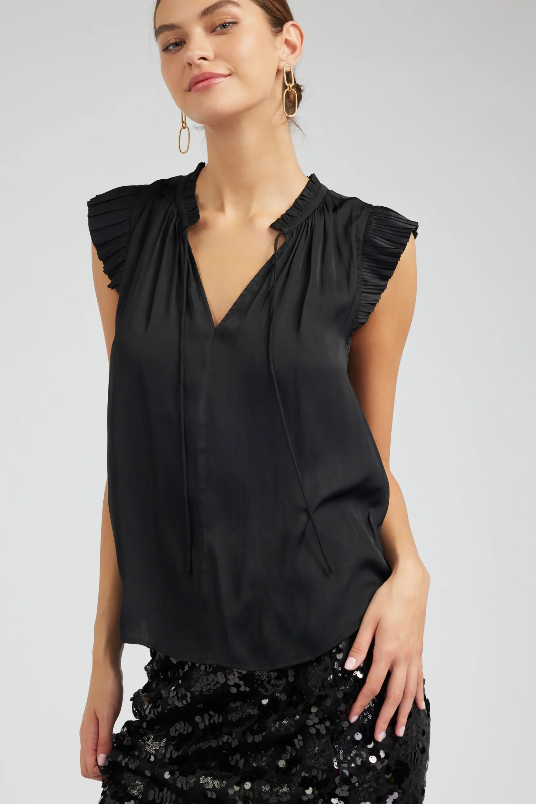 This pleated sleeve top is cut for a loose, easy fit and features a flattering split neckline with ruffle trim and tie detailing. A new favorite for your everyday wardrobe