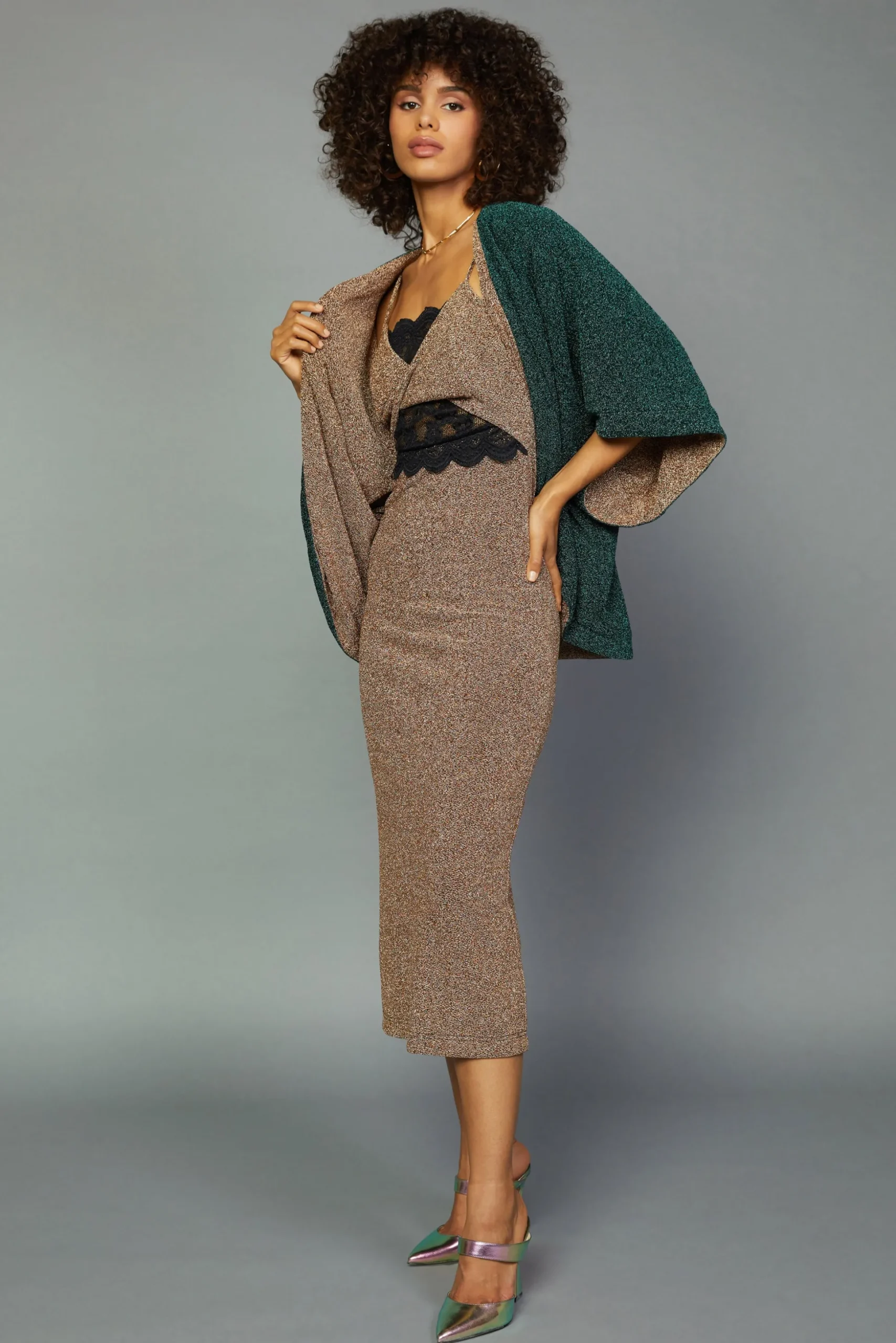 An instant favorite, this figure-skimming midi dress has an artful twist front layered over black lace piecing at the bodice. Adjustable straps let you perfect the fit. Fastened with two covered buttons and a hidden zipper at the back.
