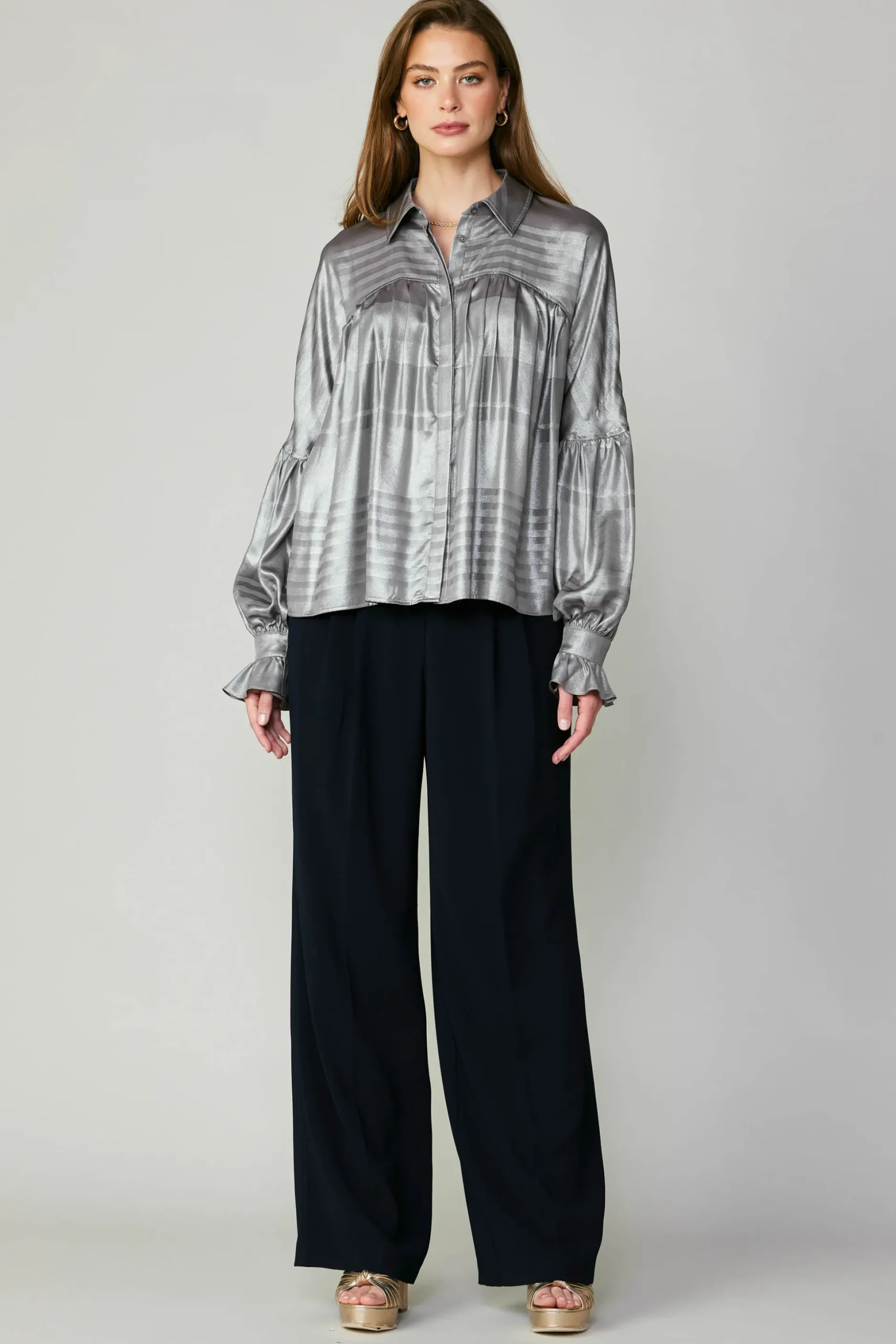 This gently crinkled metallic top instantly dresses up any look. It’s got a pointed collar, hidden button placket, and gathered piecing at the bodice and sleeves. Ruffled cuffs add to the wow factor.