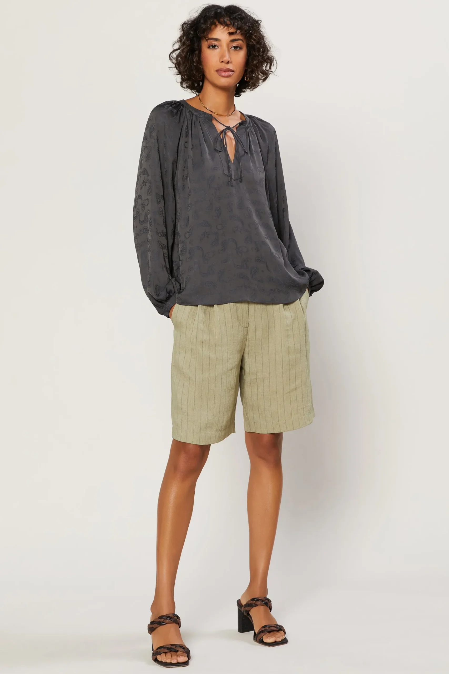Keep your days effortless in a loose, flowy top that easily tucks into a pair of wide-leg pants or a summery skirt. Done in a paisley pattern, this long-sleeve style with a split neckline and self-tie detail is the perfect way to refresh your wardrobe for the season.