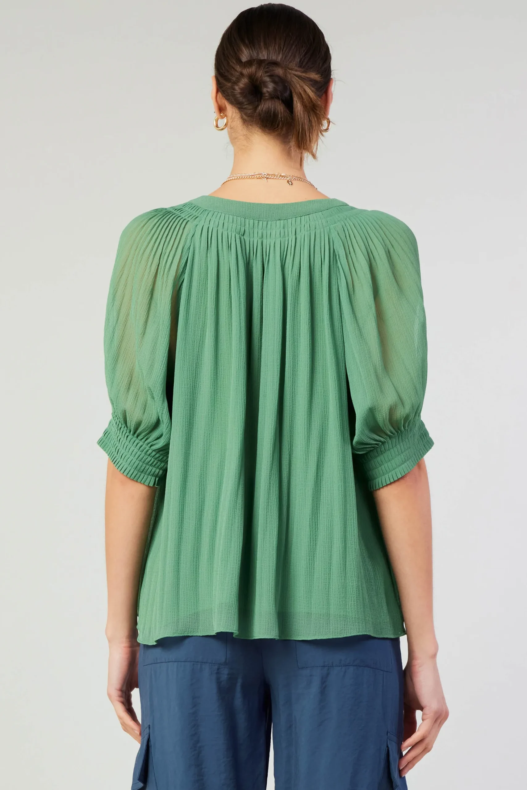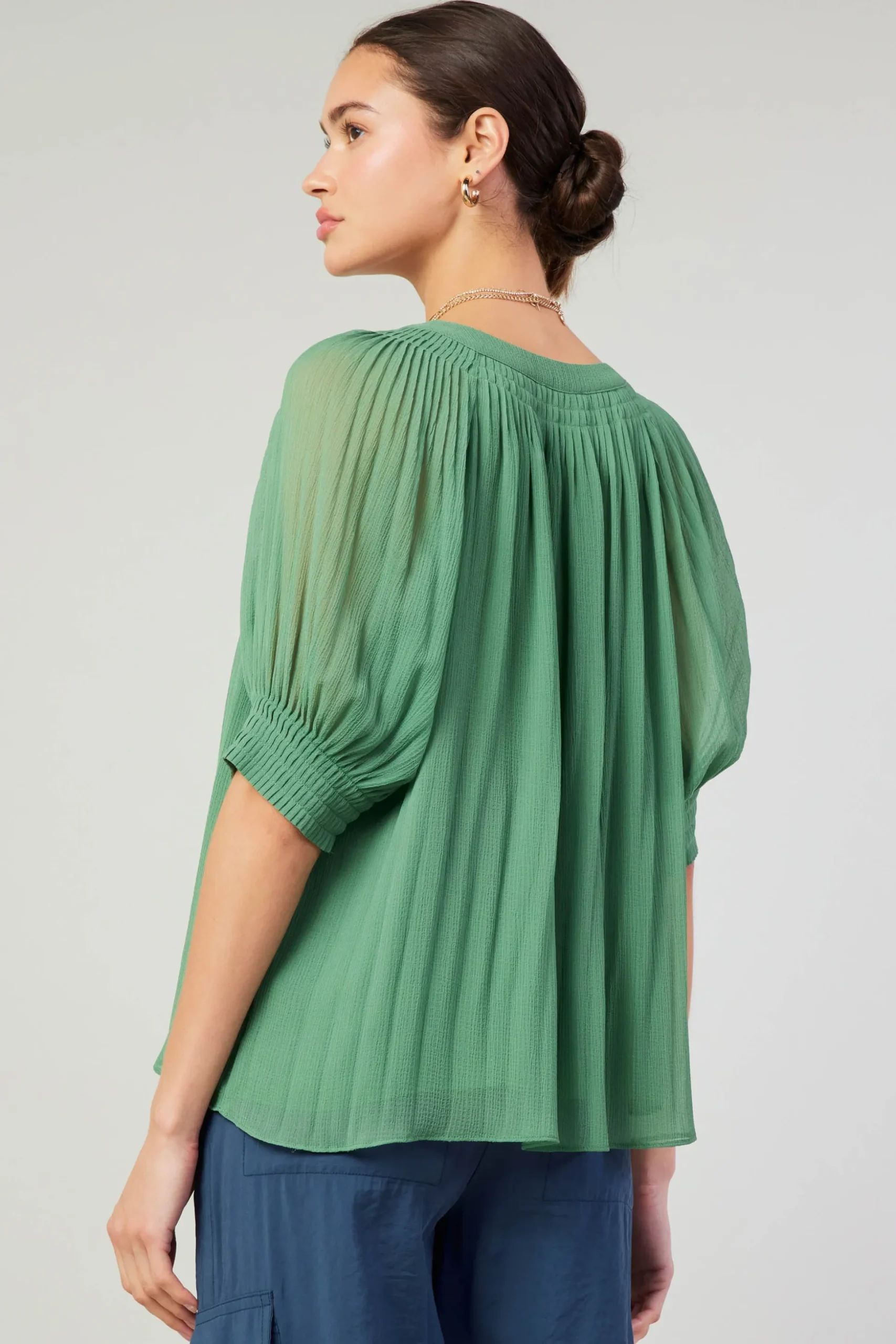 •Pleating at neckline and cuffs