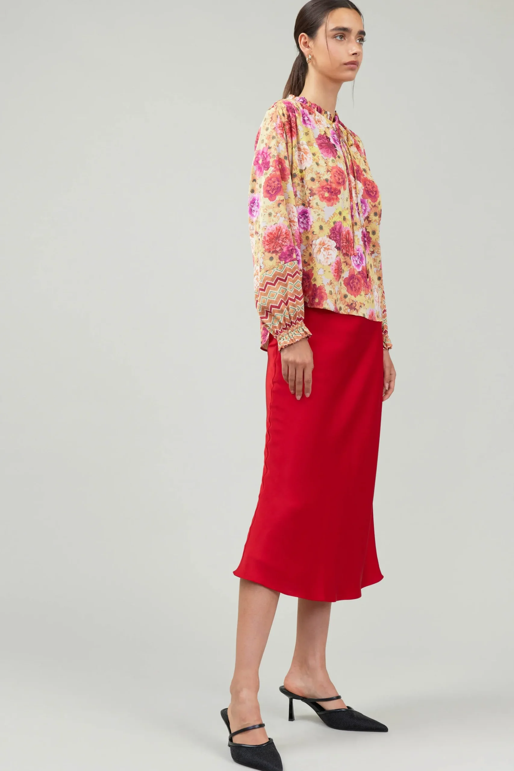 A lightweight top in a mood-boosting floral print paired against a geometric border. Relaxed and dreamy, the split-neck silhouette is enhanced by a number of pretty details—ruffle trim, self-tie neckline, dolman sleeves, and smocking to enhance the fabric’s easy drape.