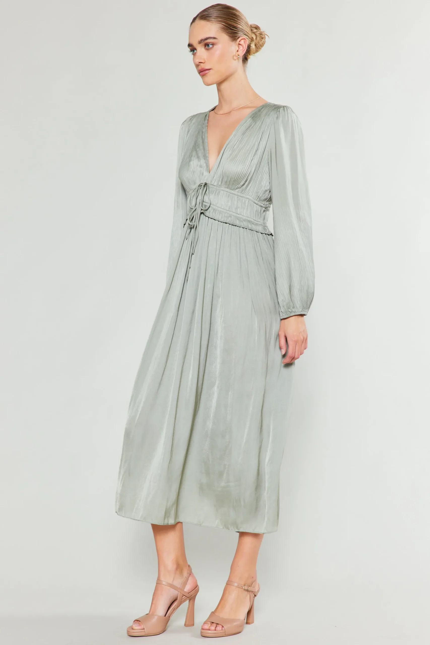 An ethereal long-sleeve dress fit for a modern goddess. With a plunging neckline and delicate pleated top that ties at the center, it’s truly a stunner.