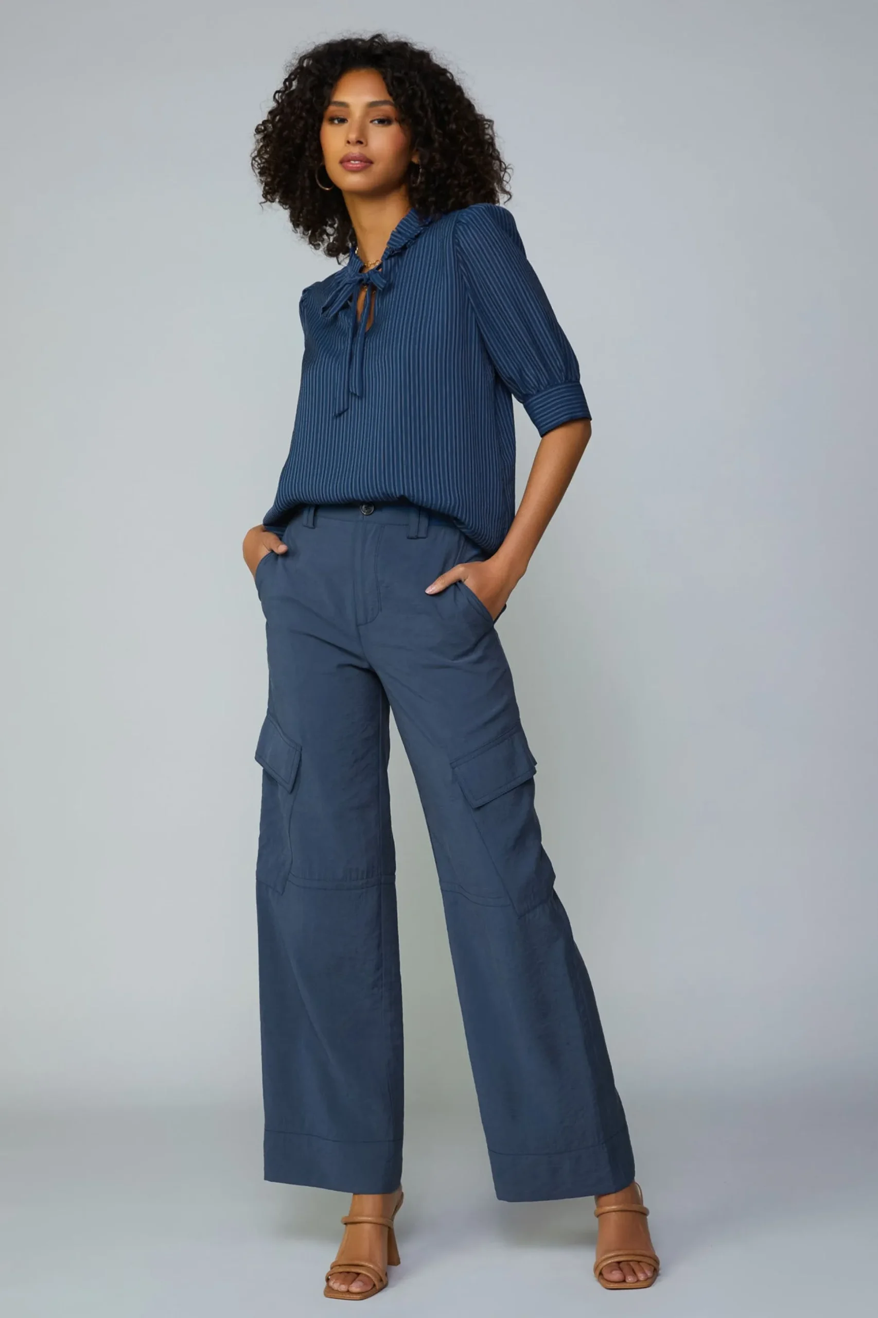 A sweet addition to your style lineup, this popover top has a softly crinkled texture, plus a split neckline, pleated frills, and puffed half sleeves. A dainty tie completes the look.