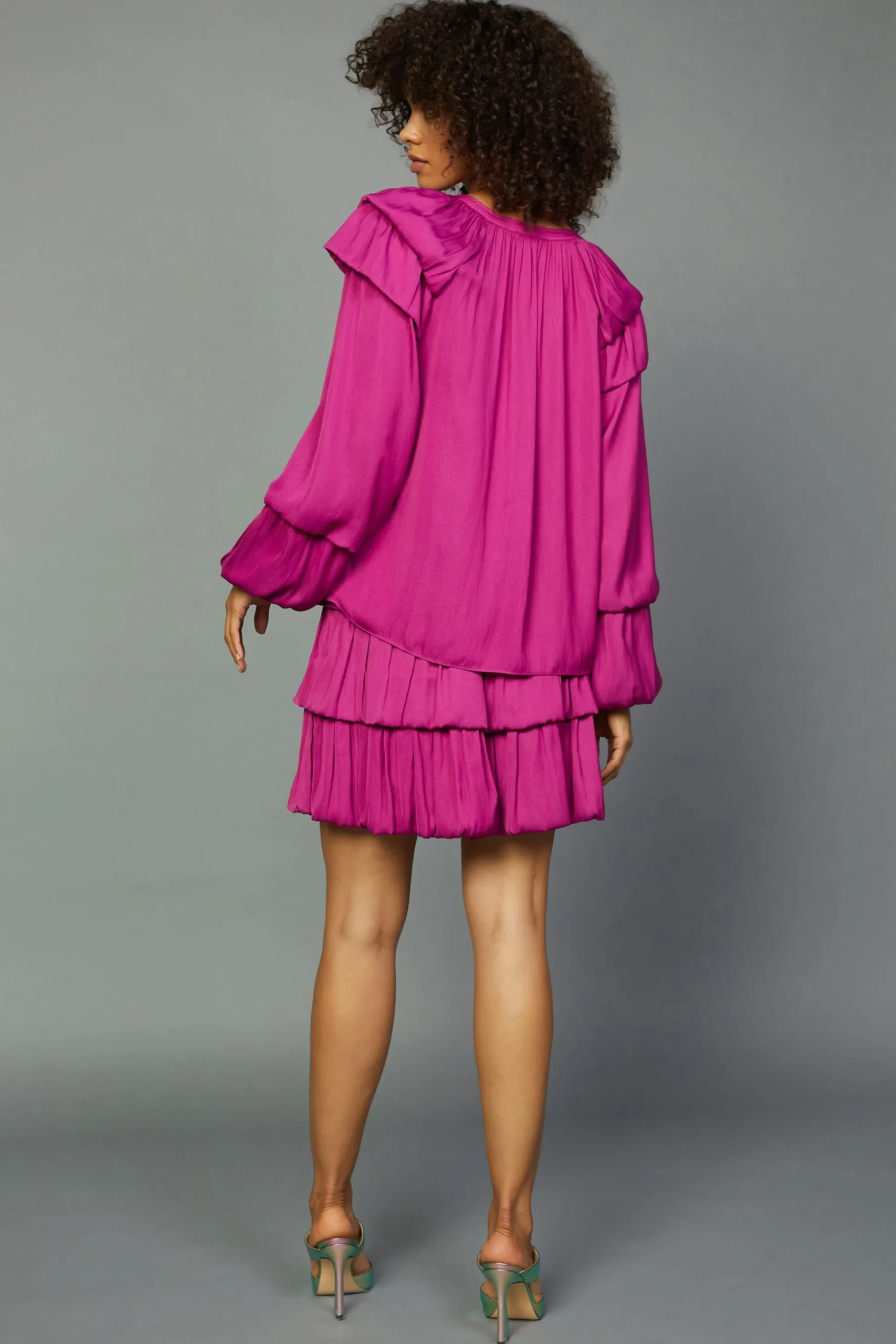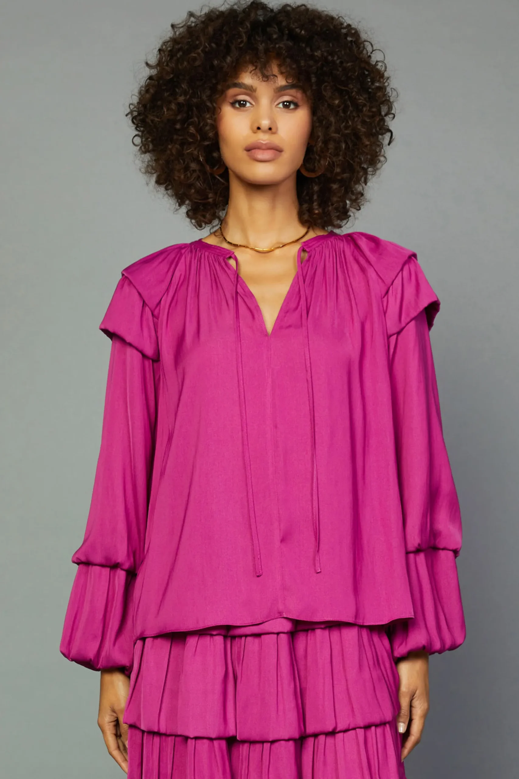 Tiered bubble sleeves create volume on this pretty split-neck blouse. Lightweight and relaxed, it’s got sweet self-tie detailing and gentle gathers that enhance the flowy fit.