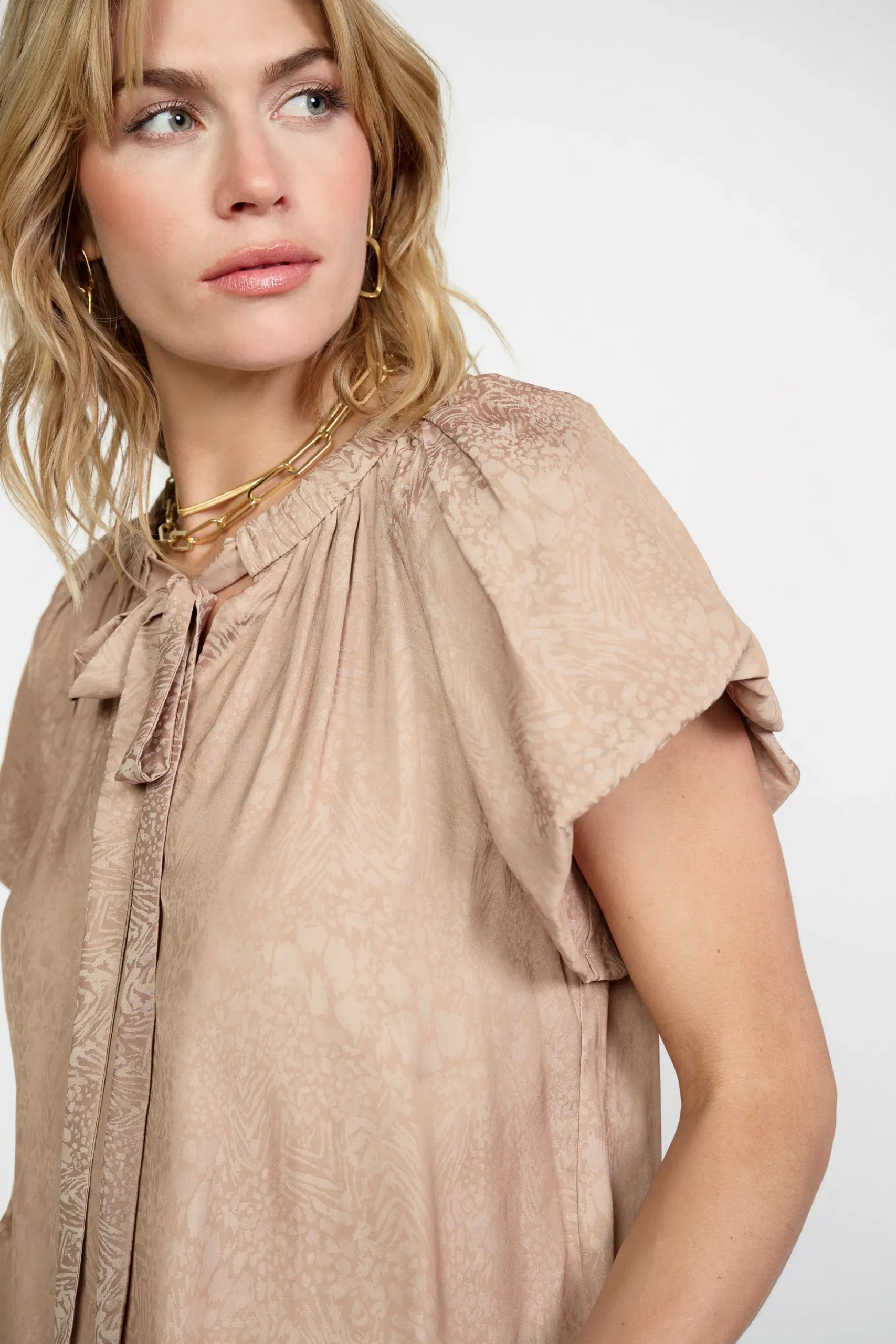 “Between the tied neckline and bubble sleeves, this airy blouse is effortlessly feminine. It practically floats off the body, crafted from taupe jacquard with an abstract motif woven in. Style it for work or the weekend.