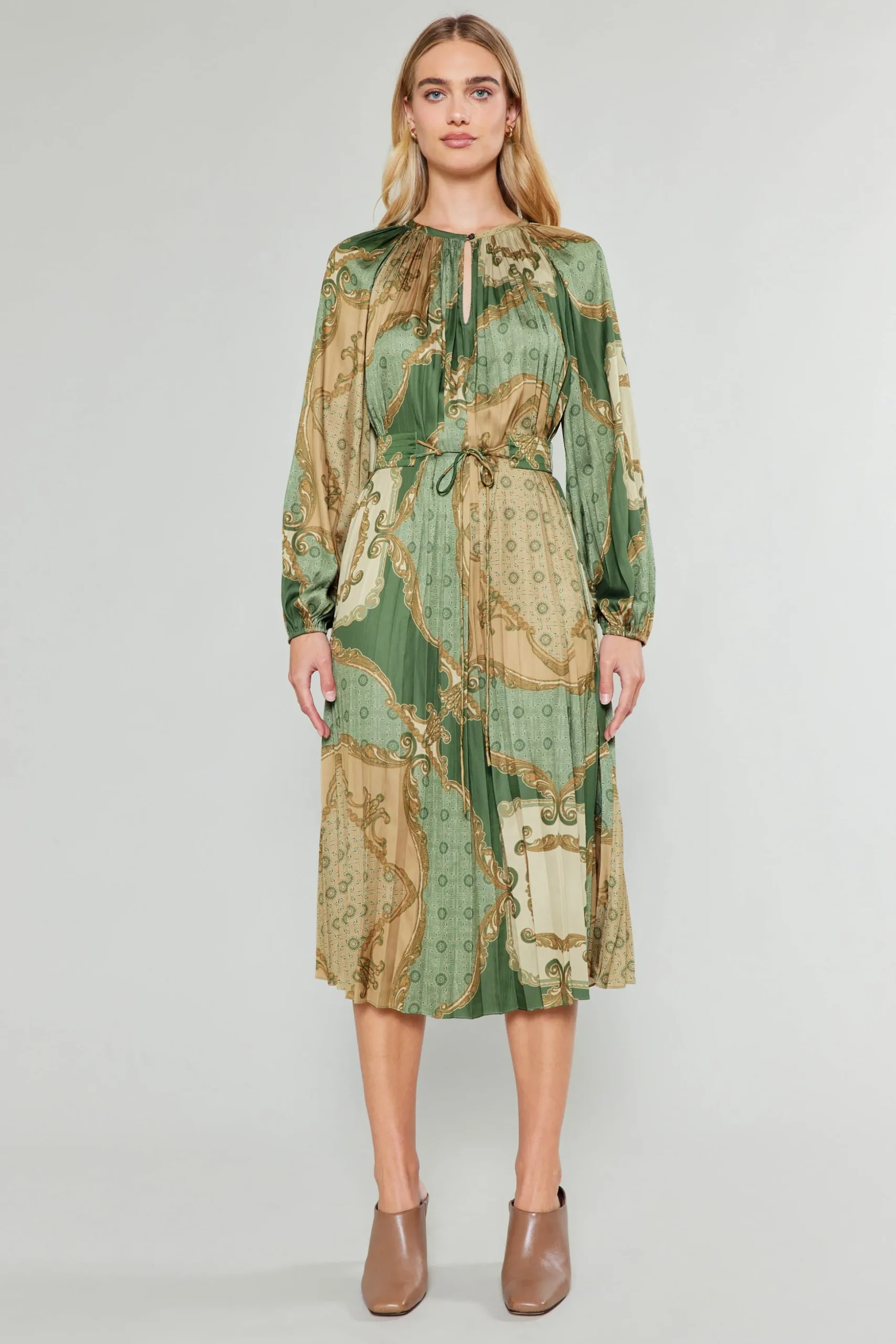This printed dress is defined by accordion pleats that drape beautifully on the figure. The long-sleeve number has a split neckline that’s fastened by a single button. A quilted belt cinches the waist, creating an ultra-flattering silhouette.