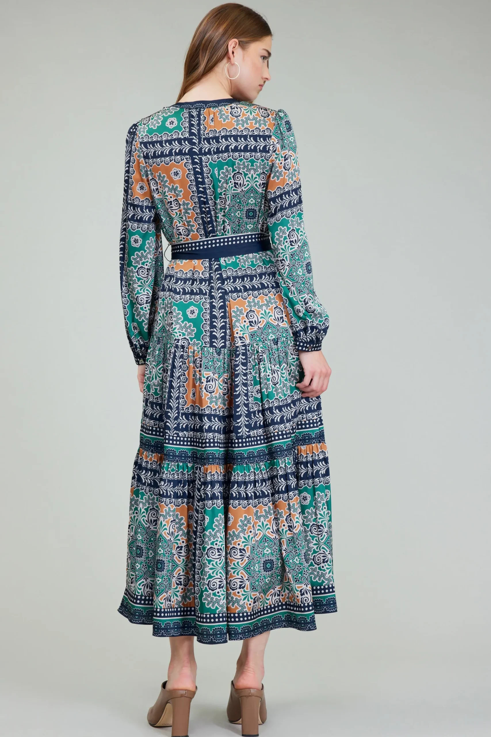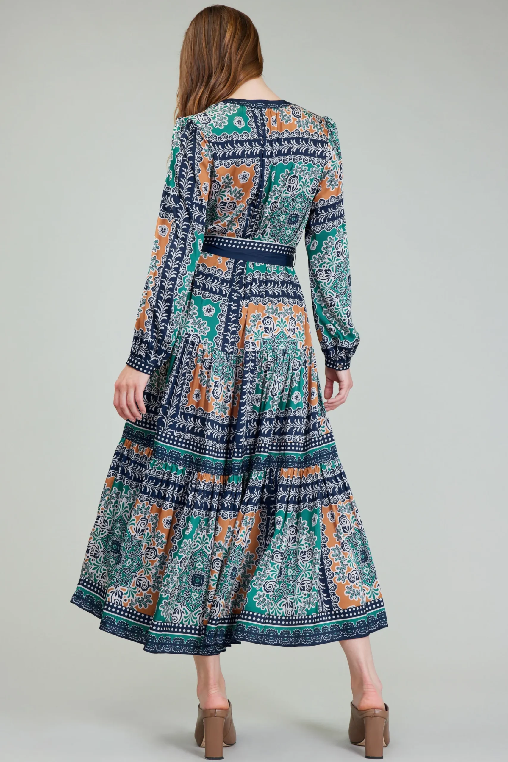 This split-neck dress showcases an intricate print with dotted trim along the neckline, cuffs, and tiered skirt. Framed by puffed sleeves, it ties at the waist and flows effortlessly to a shin-grazing hem.