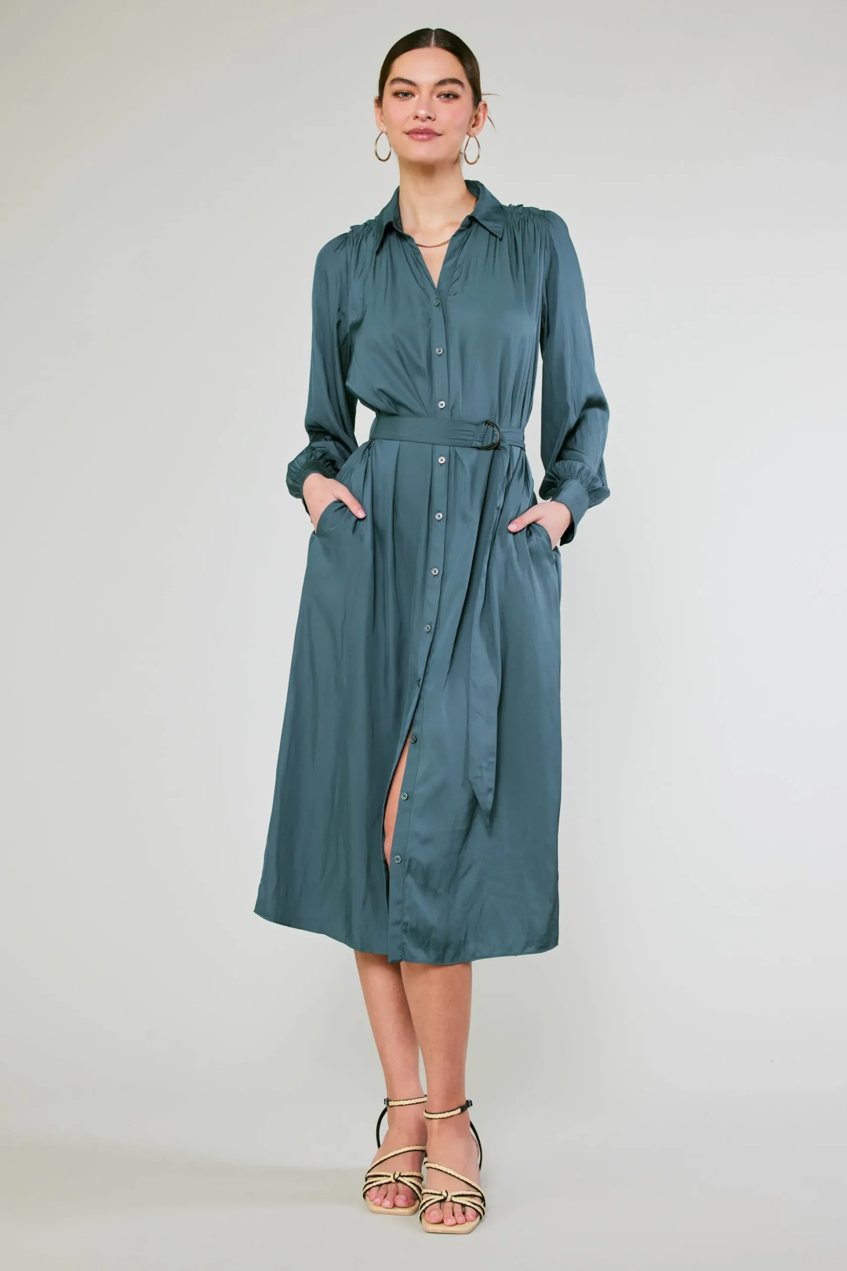 The classic shirt dress, refreshed. Designed with an open neckline and spread collar, this long-sleeve number buttons up at the front and features gently gathered shoulders. Cinch the waist with the matching D-ring belt.