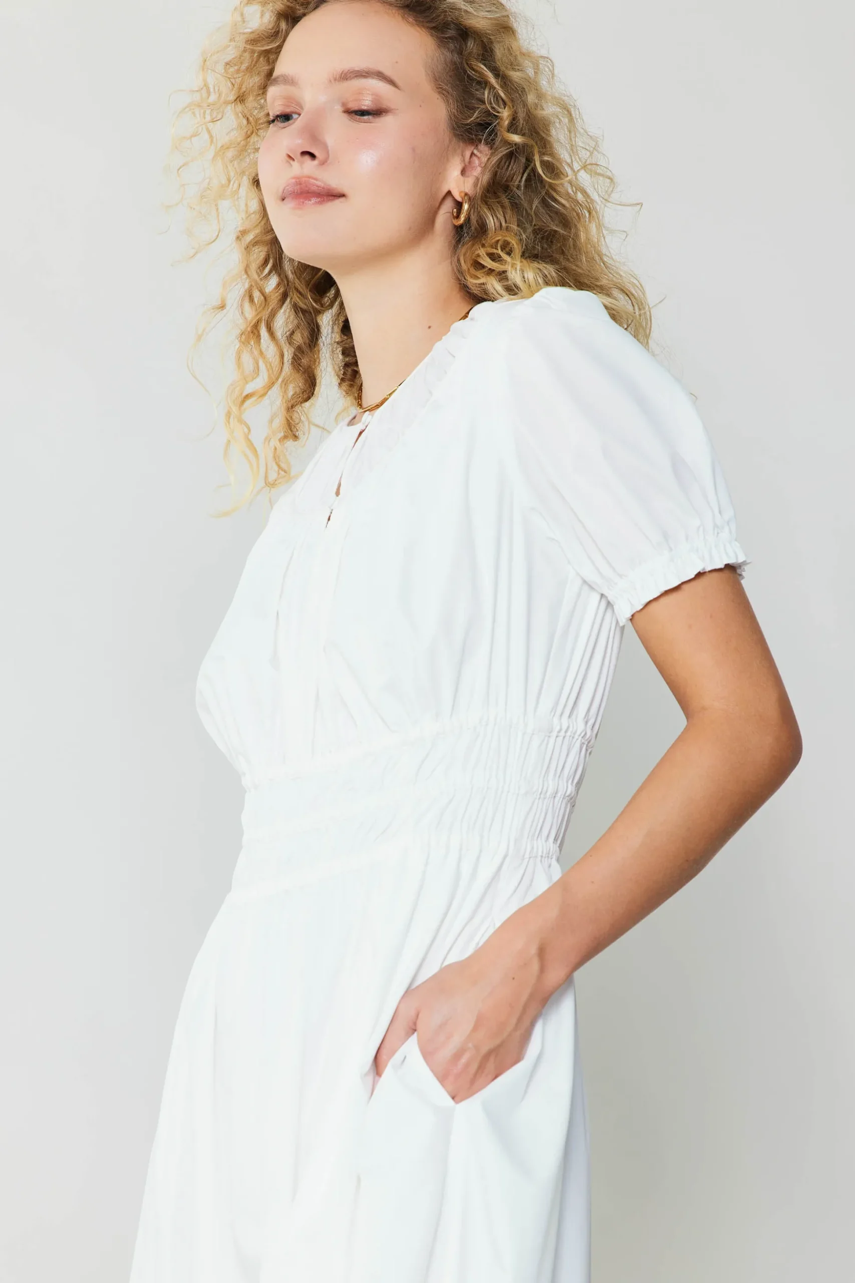 Feminine details and a crinkled texture add to the allure of this round-neck midi dress in a classic white shade. It’s elegant yet so easy to wear, cut with short-sleeve styling and comfortably cinched at the waist.