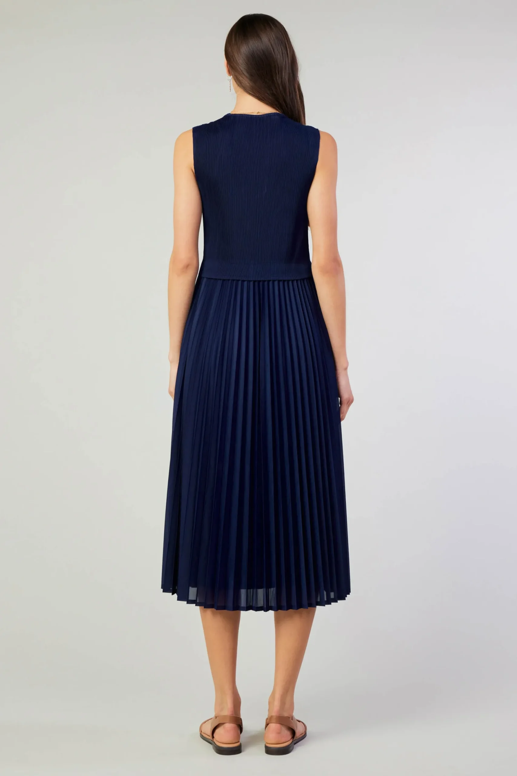 This sleeveless midi dress is all about tonal texture contrast. On top, it’s a figure-hugging rib knit. From the waist down, you’ve got a semi-sheer woven skirt with crisp pleats. Perfection together.