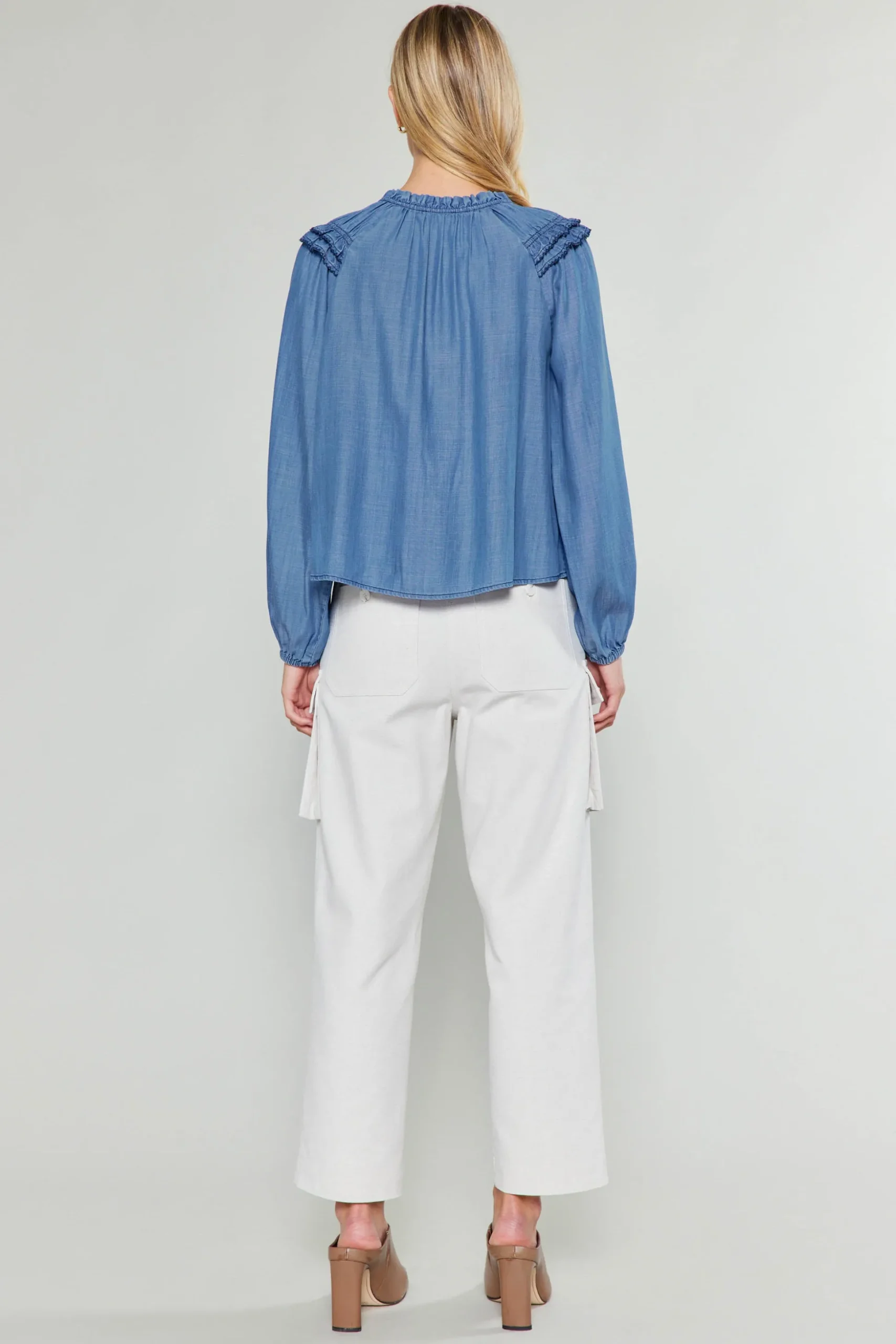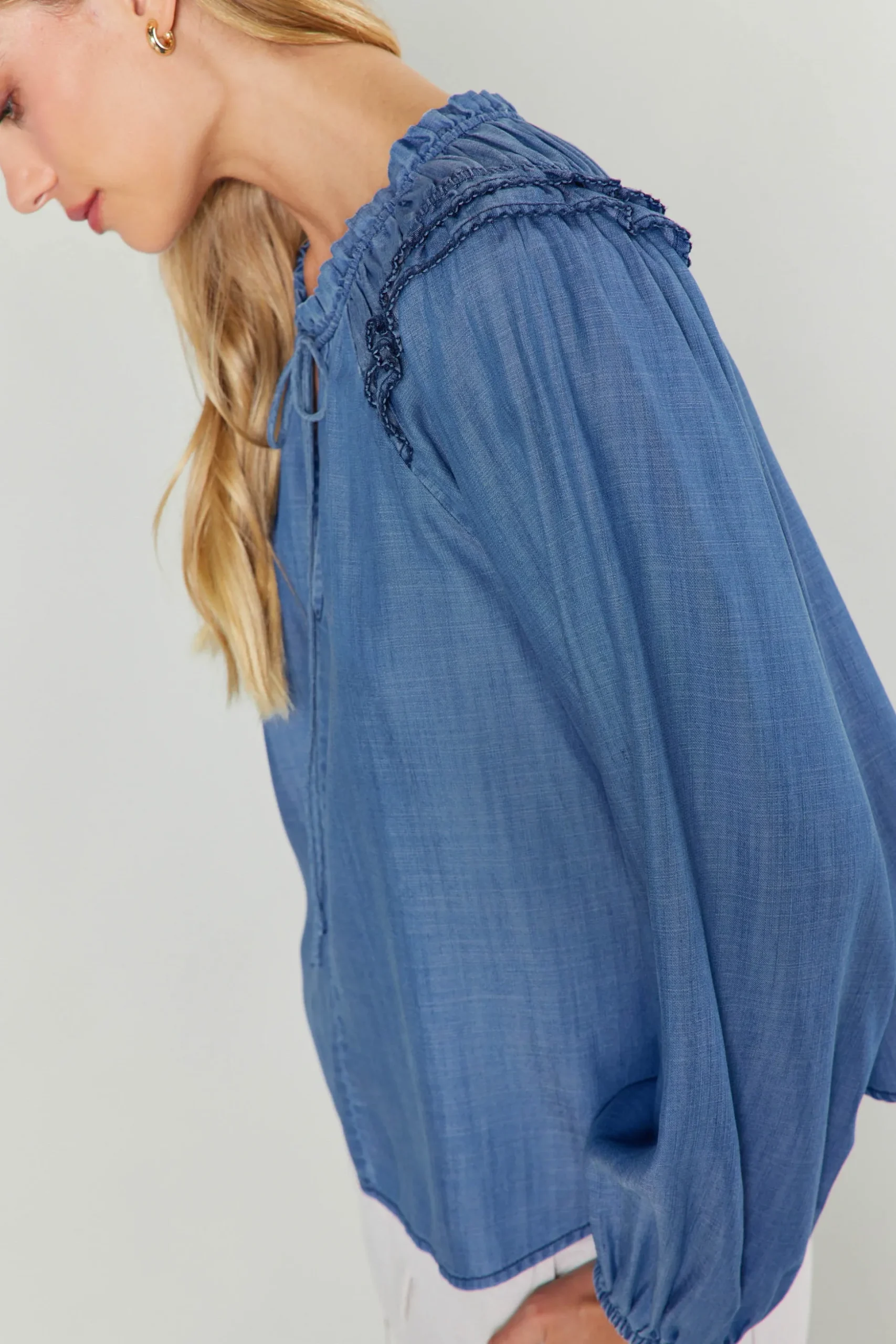 Reach for this chambray blouse when the day calls for something light and airy. Cut for a relaxed silhouette, this split-neck top has a swingy shape and long, puffed sleeves topped by picot-stitched ruffles.