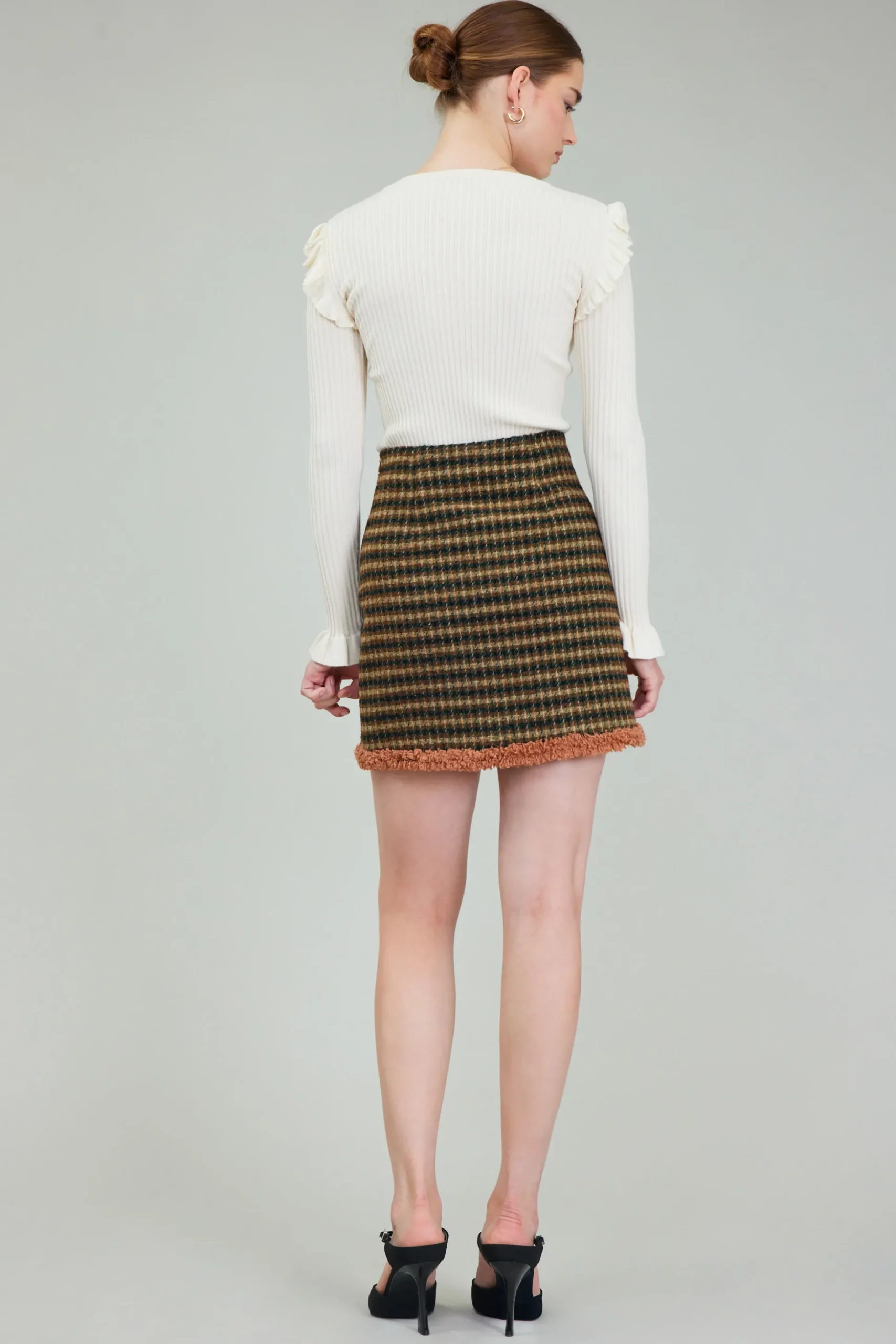 Houndstooth has never looked cooler. The classic check pattern contrasts with faux fur on the design of this mini skirt.