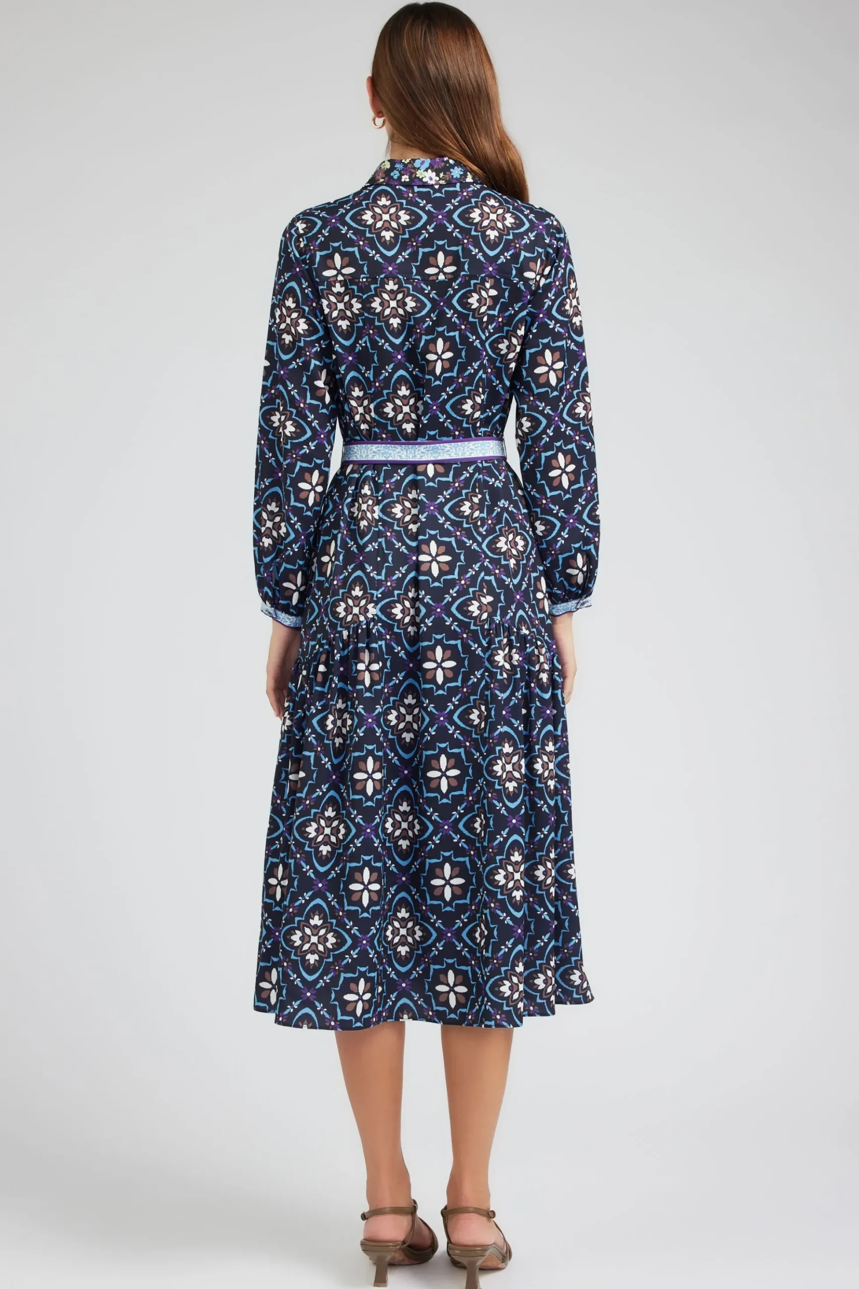Decorated with a striking tile print, this shirt dress has a flowing silhouette and a contrast floral border. It buttons up at the front and ties at the waist, creating a defined, flattering shape.