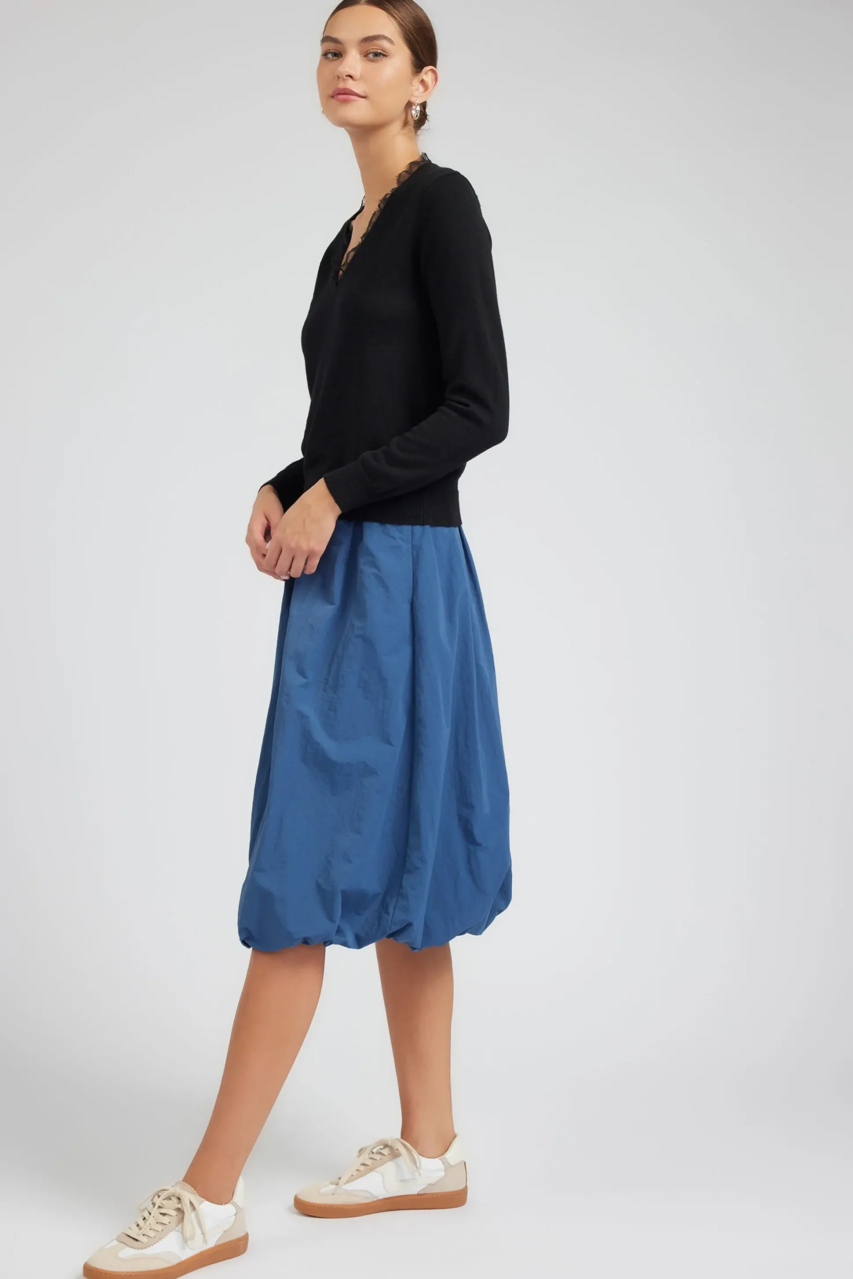 A classic long-sleeve sweater with a little something special. Done in a fine-gauge knit, it’s defined by a V-shaped neckline and accented by delicate eyelash lace.