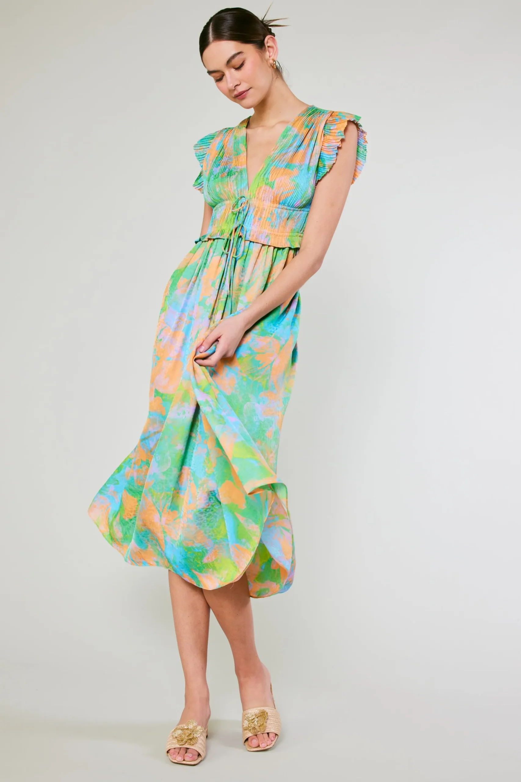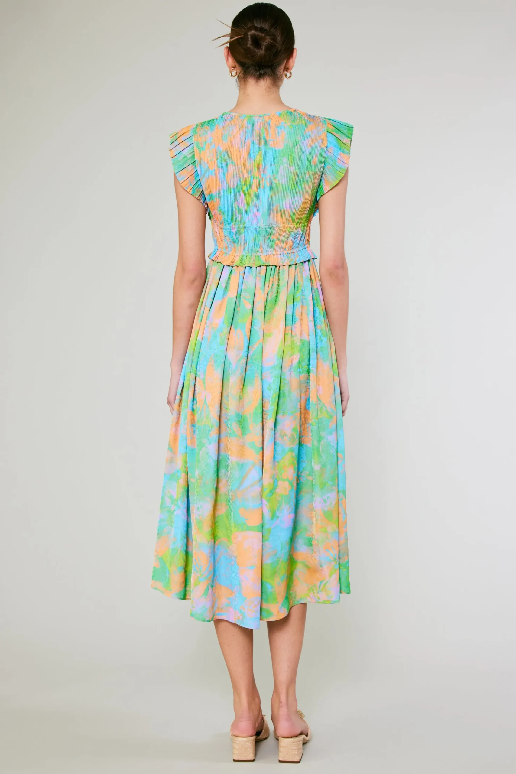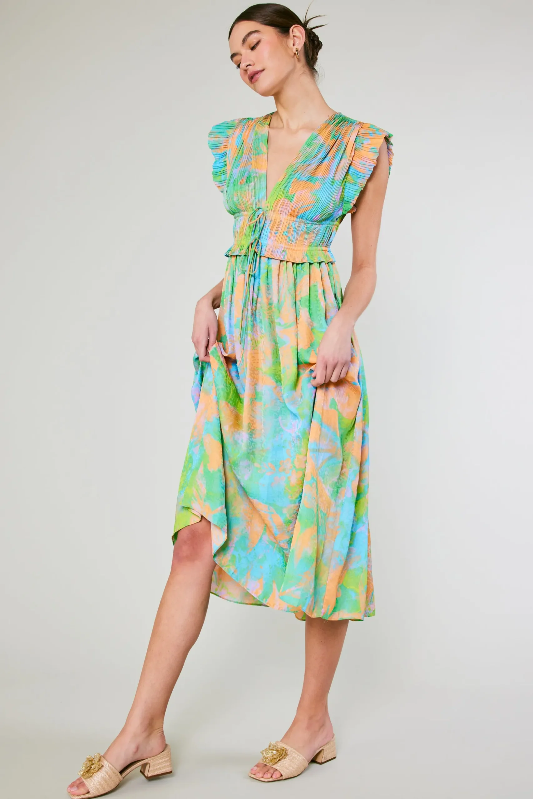 This dress is so striking—first of all, that abstract floral print is an absolute showstopper with its rainbow effect. But it doesn’t stop there. Cut from lightweight jacquard featuring a subtle jacquard texture, the dress has tons of tiny pleats at the bodice, dainty ties, and fluttery pleated sleeves, all before flowing to a shin-skimming length.