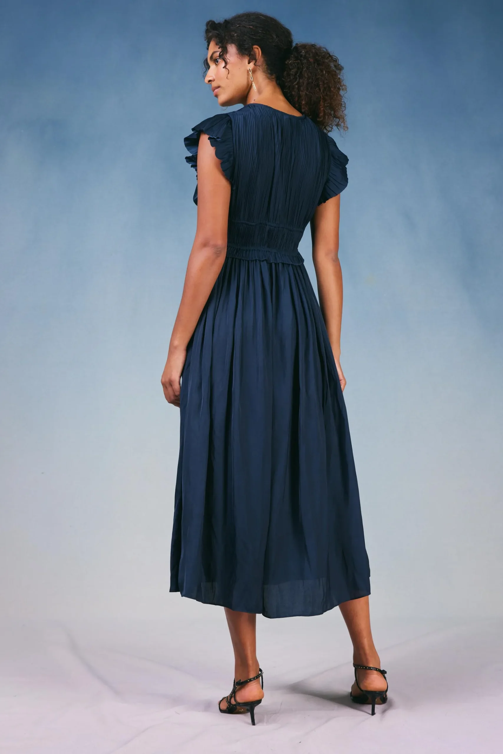 Just a few reasons to adore this V-neck maxi dress: ruffled shoulder panels, billowy shoulder sleeves, and the way all those pleats flow to a slightly asymmetrical hem. So pretty.