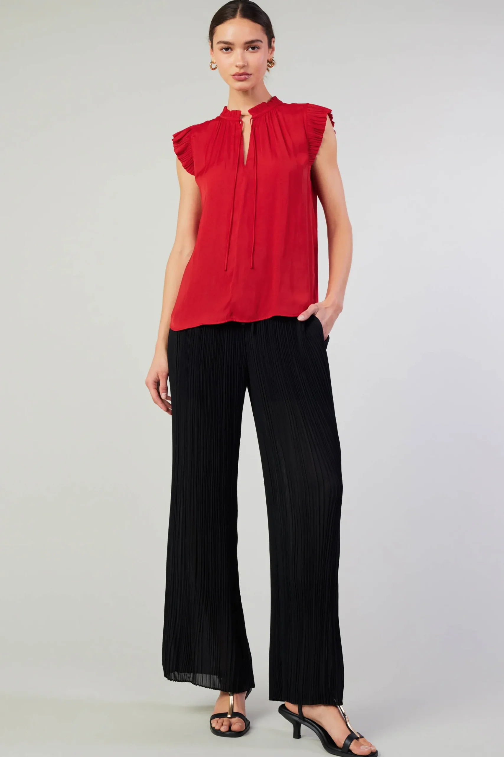 This pleated sleeve top is cut for a loose, easy fit and features a flattering split neckline with ruffle trim and tie detailing. A new favorite for your everyday wardrobe