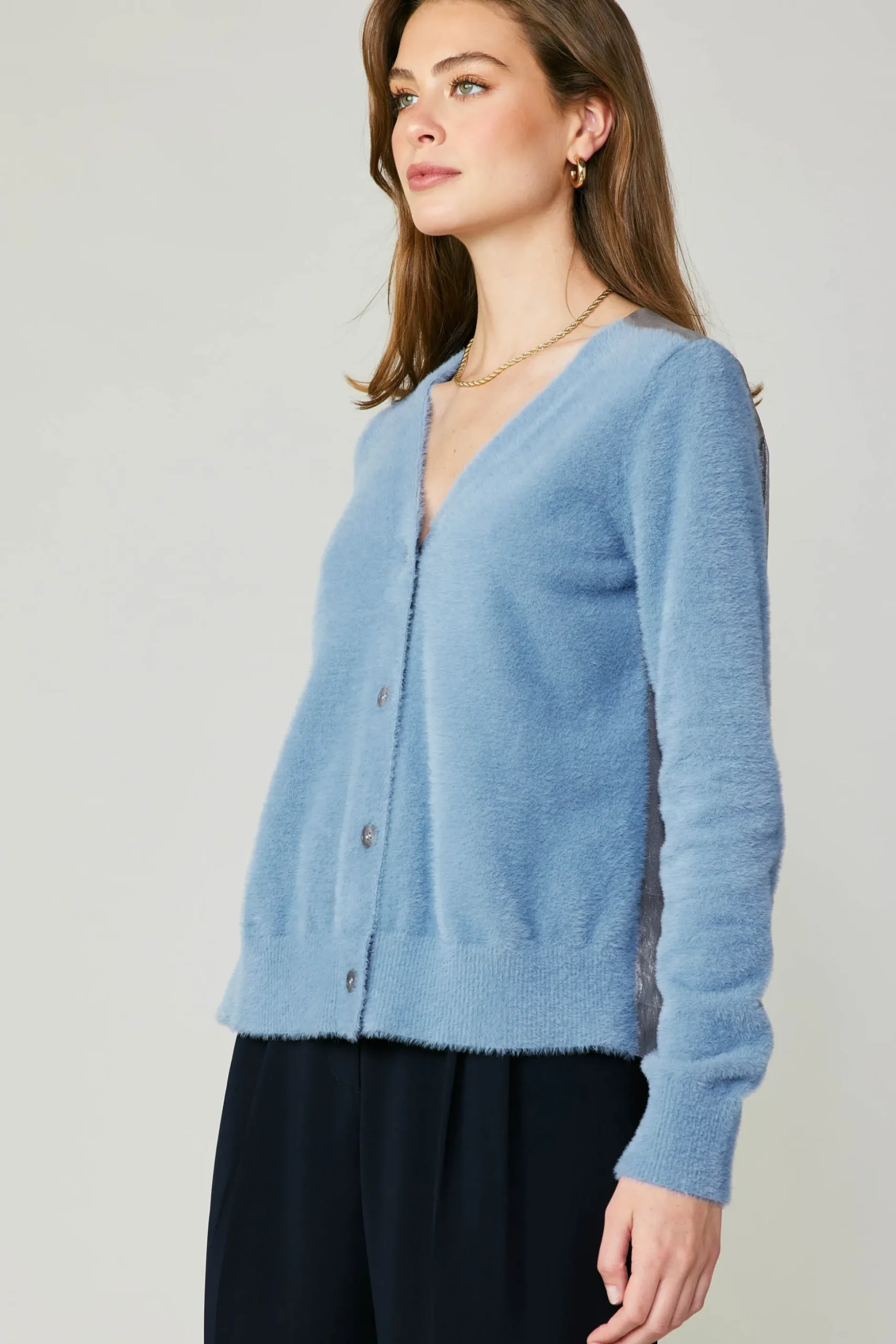 Soft and fuzzy at the front, party in the back. This button-up cardigan is knitted for an irresistibly cozy texture and contrasted by a metallic woven back with subtle stripe accents.