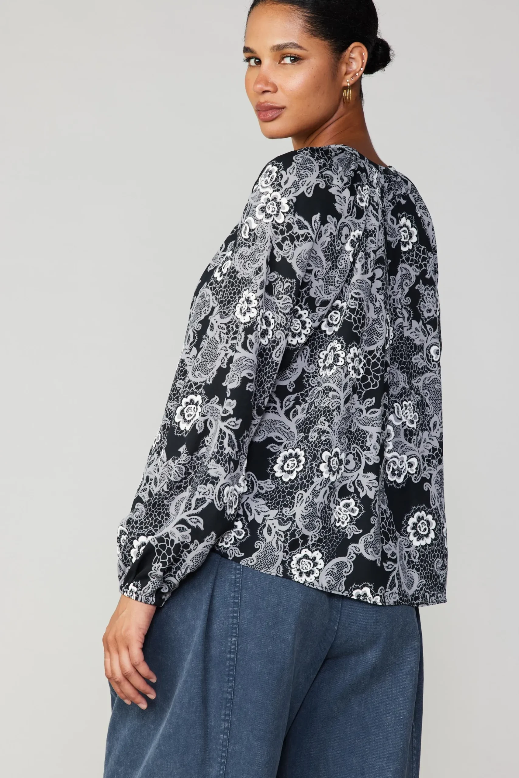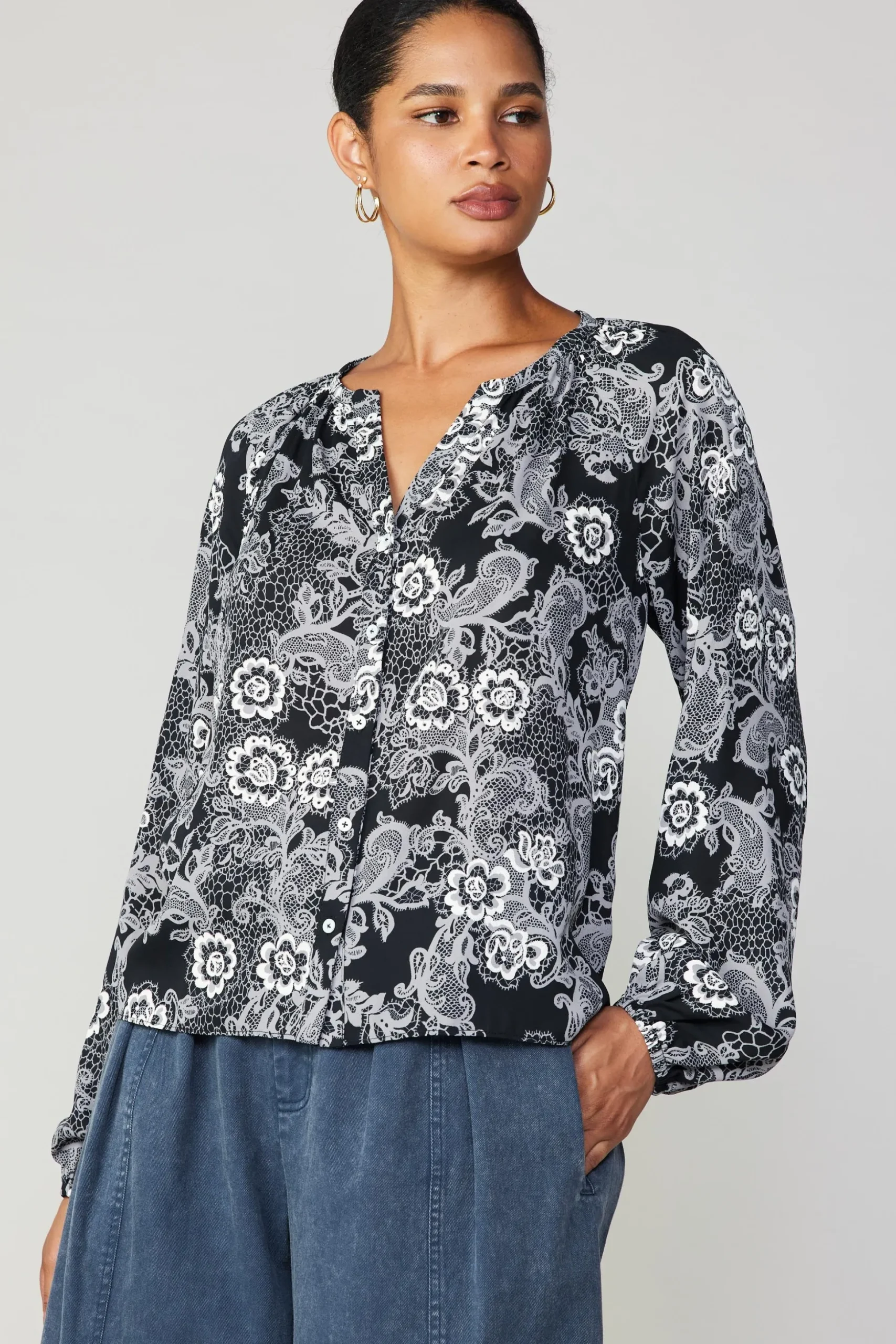 A monochromatic lace print lends a graphic look to this split-neck blouse. Cut for a loose, easy silhouette, it’s got long sleeves and buttons down the front.
