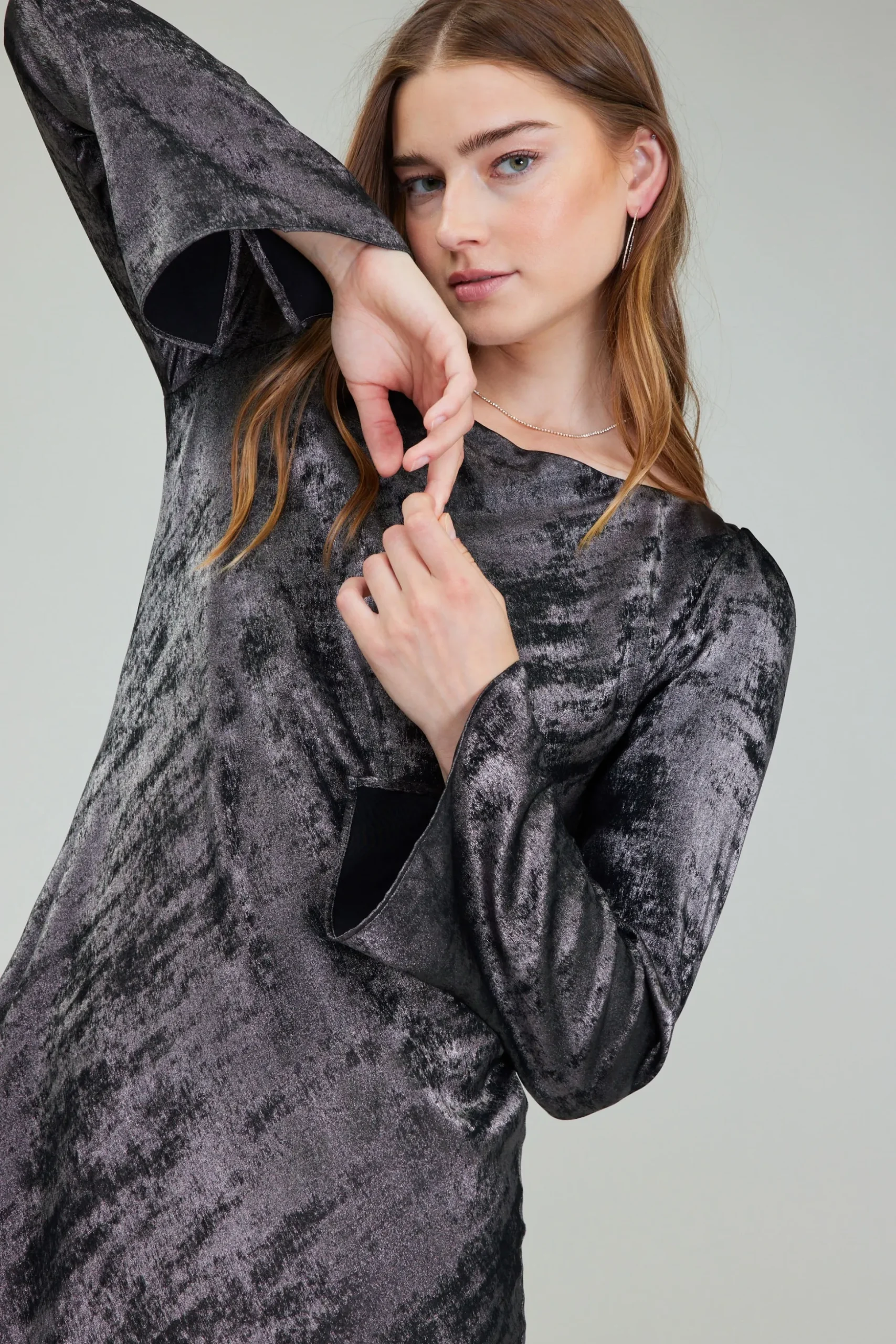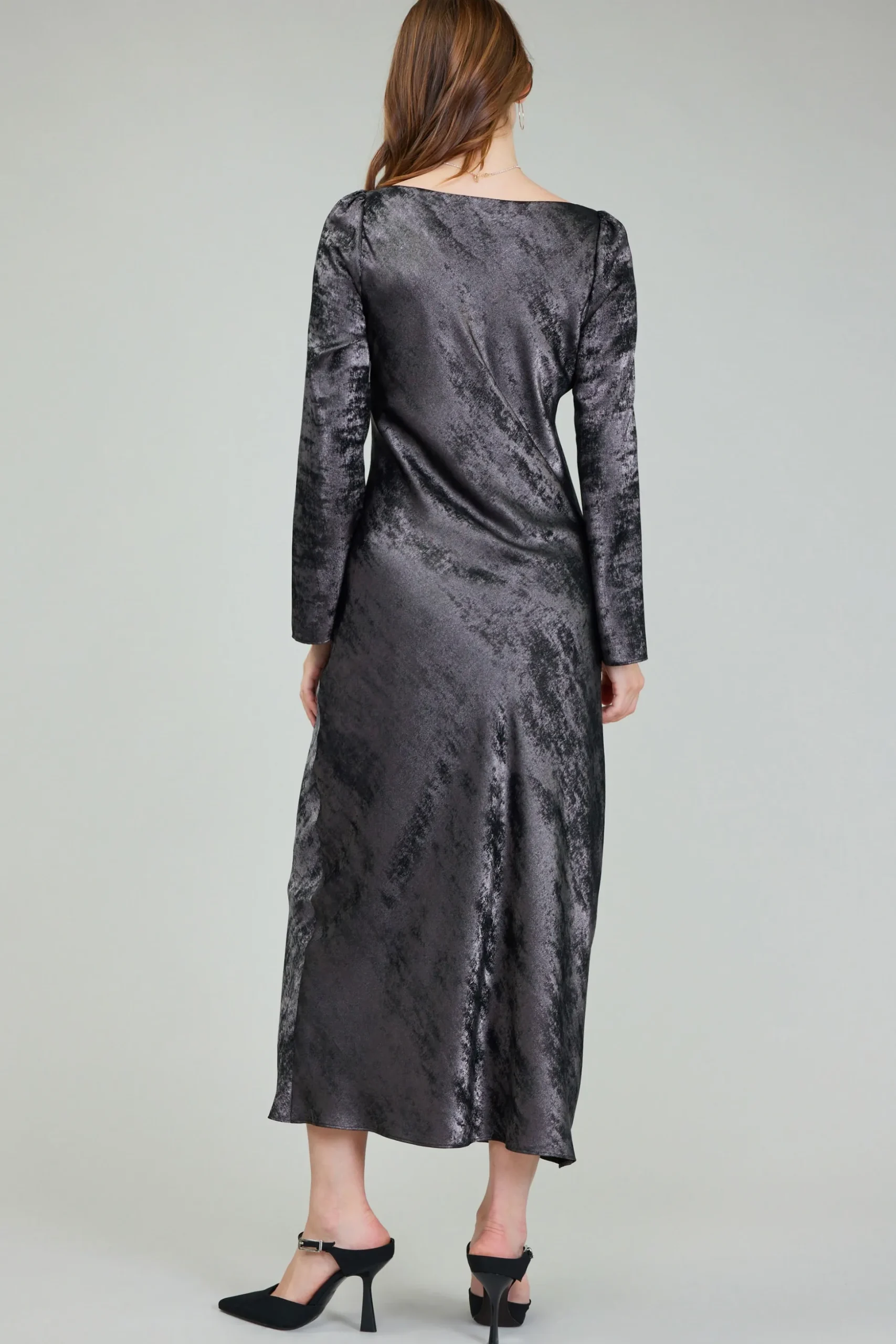 Simple yet incredibly chic, this lustrous dress has a graceful boat neckline and long sleeves with gathered shoulders. It has a shimmery sheen and flattering in a body-skimming silhouette that lands at the shins. Metallic threading woven throughout adds a touch of luxury.