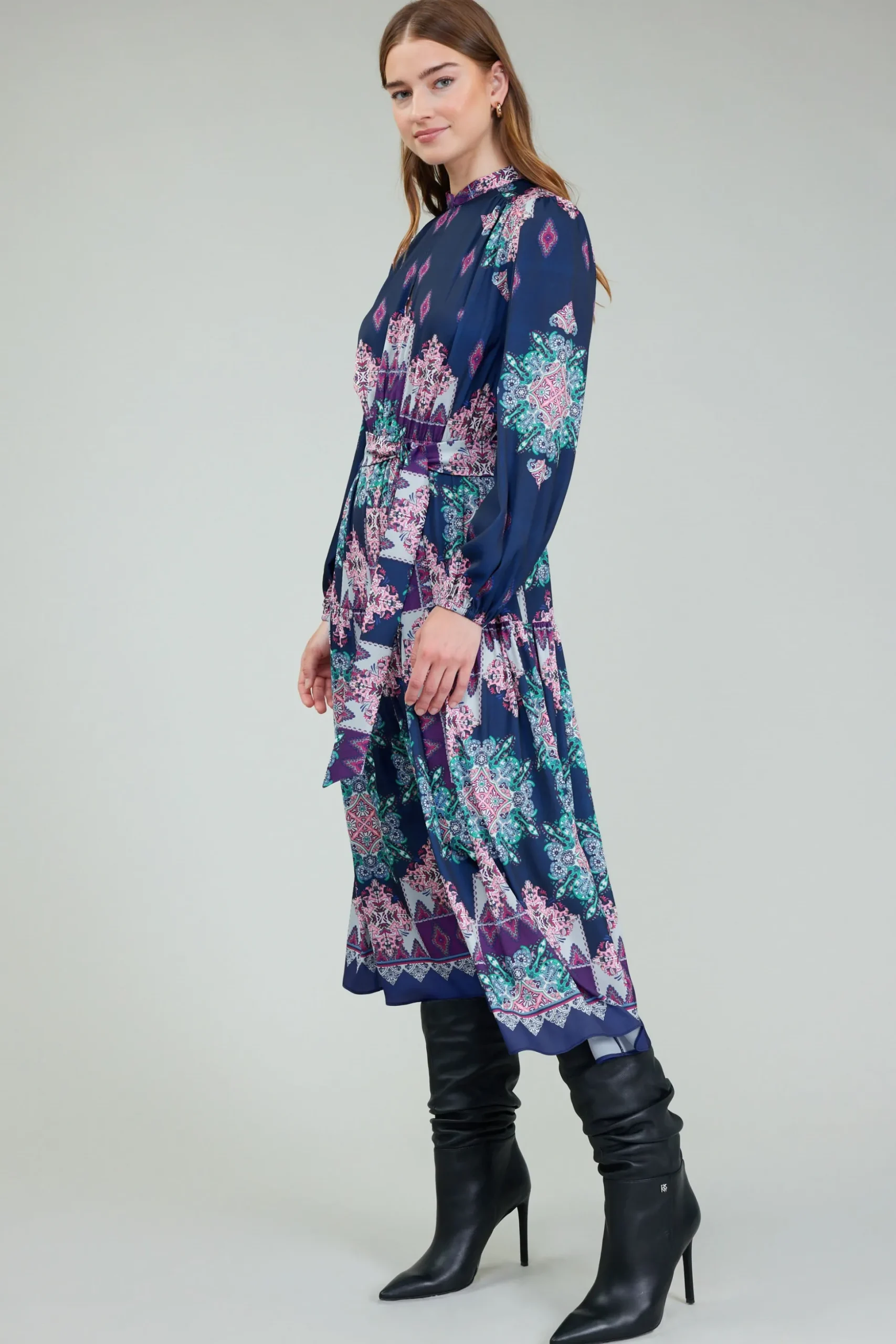 A printed midi dress in a palette of jewel tones is just right for bringing your look into the new season. Topped by a mandarin collar, this one has slightly puffed sleeves, a waist-defining tie belt, and gentle gathers at the skirt.