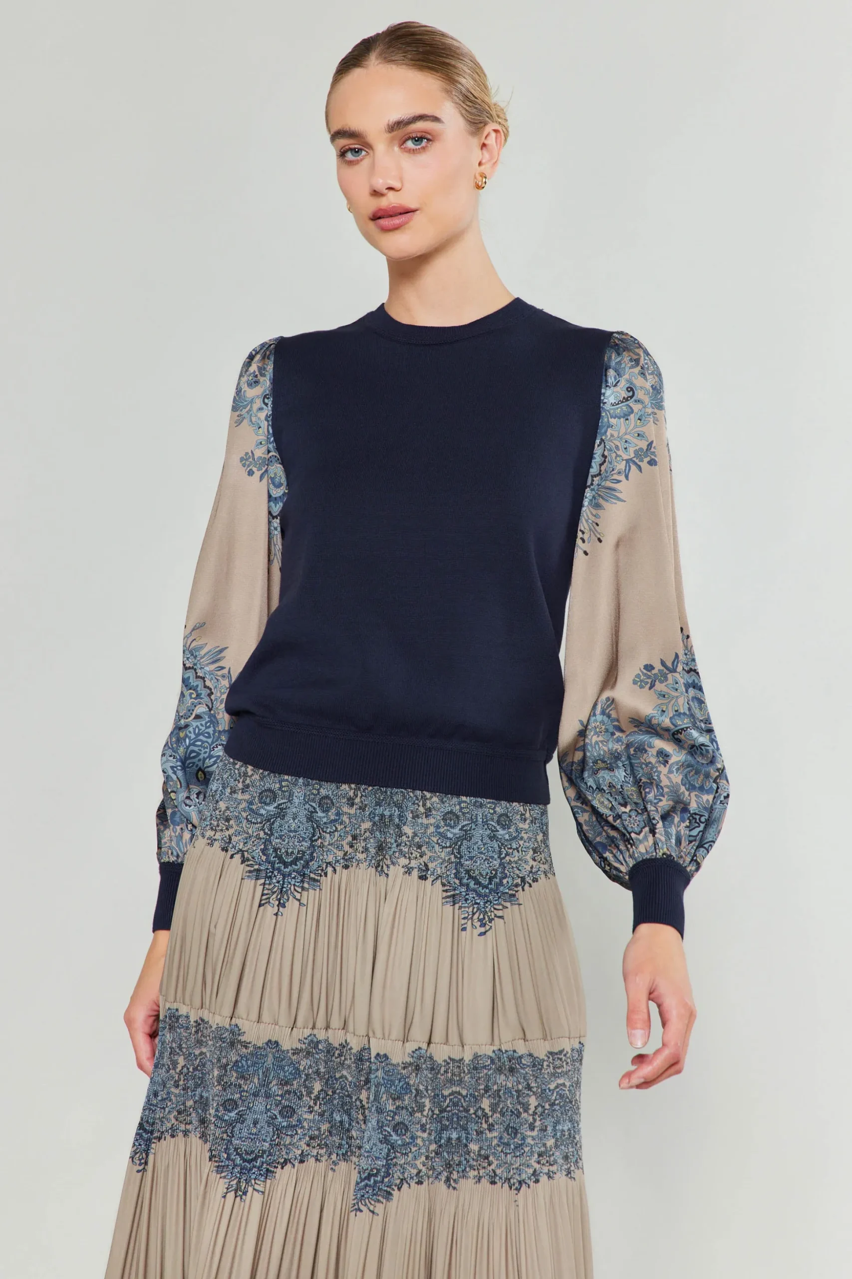 A soft-spun knit and a lustrous woven fabric combine to create a striking contrast of textures on this long-sleeve sweater. A refined addition to your cool-weather wardrobe.