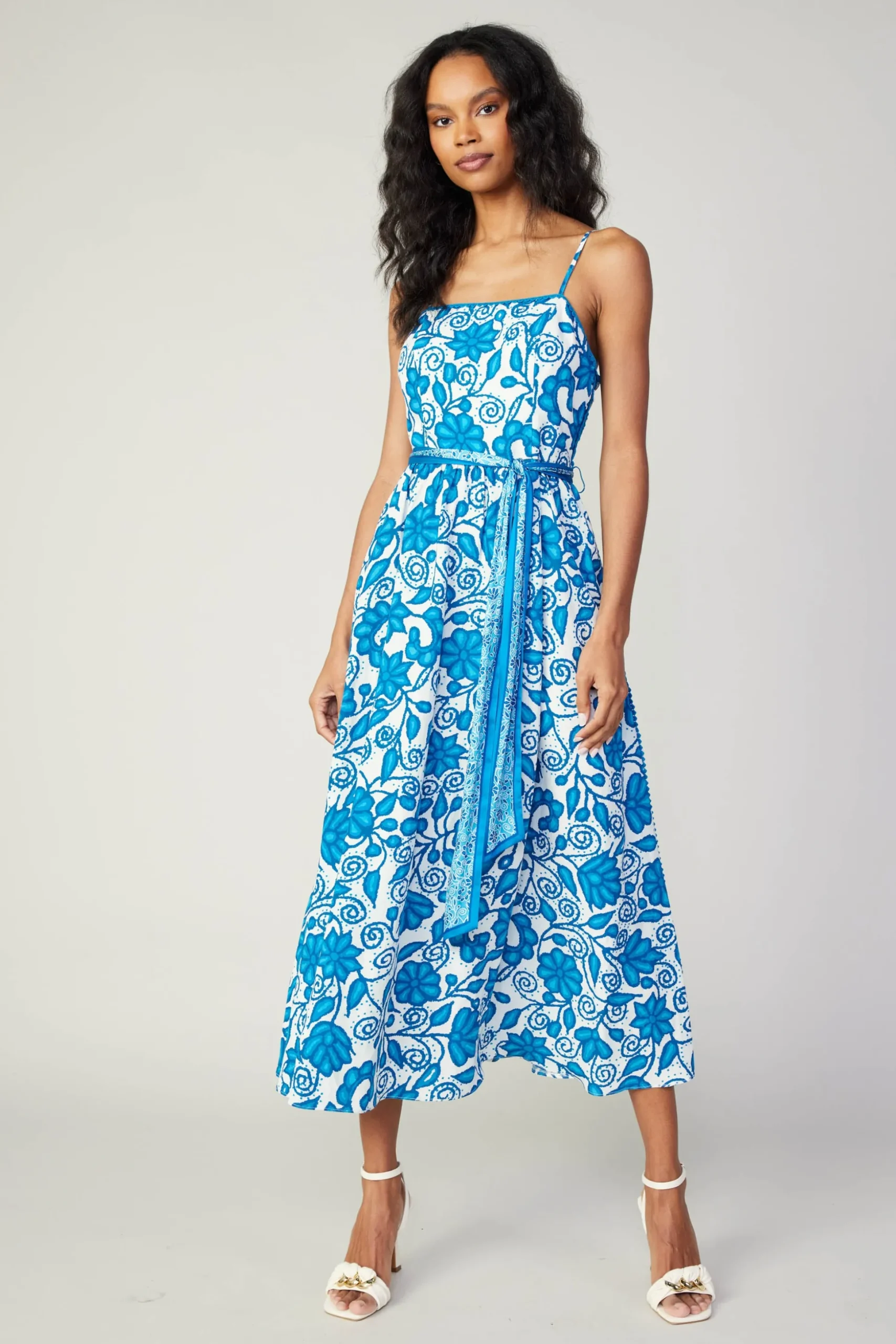 A vibrant blue-on-white floral print makes this midi dress stand out from the crowd. The strappy silhouette has a fitted bodice with blue scallop trim and stretch smocking at the back to keep you feeling comfortable. Accented by a contrasting self-tie scarf at the waist, it falls to a loose, shin-skimming skirt.