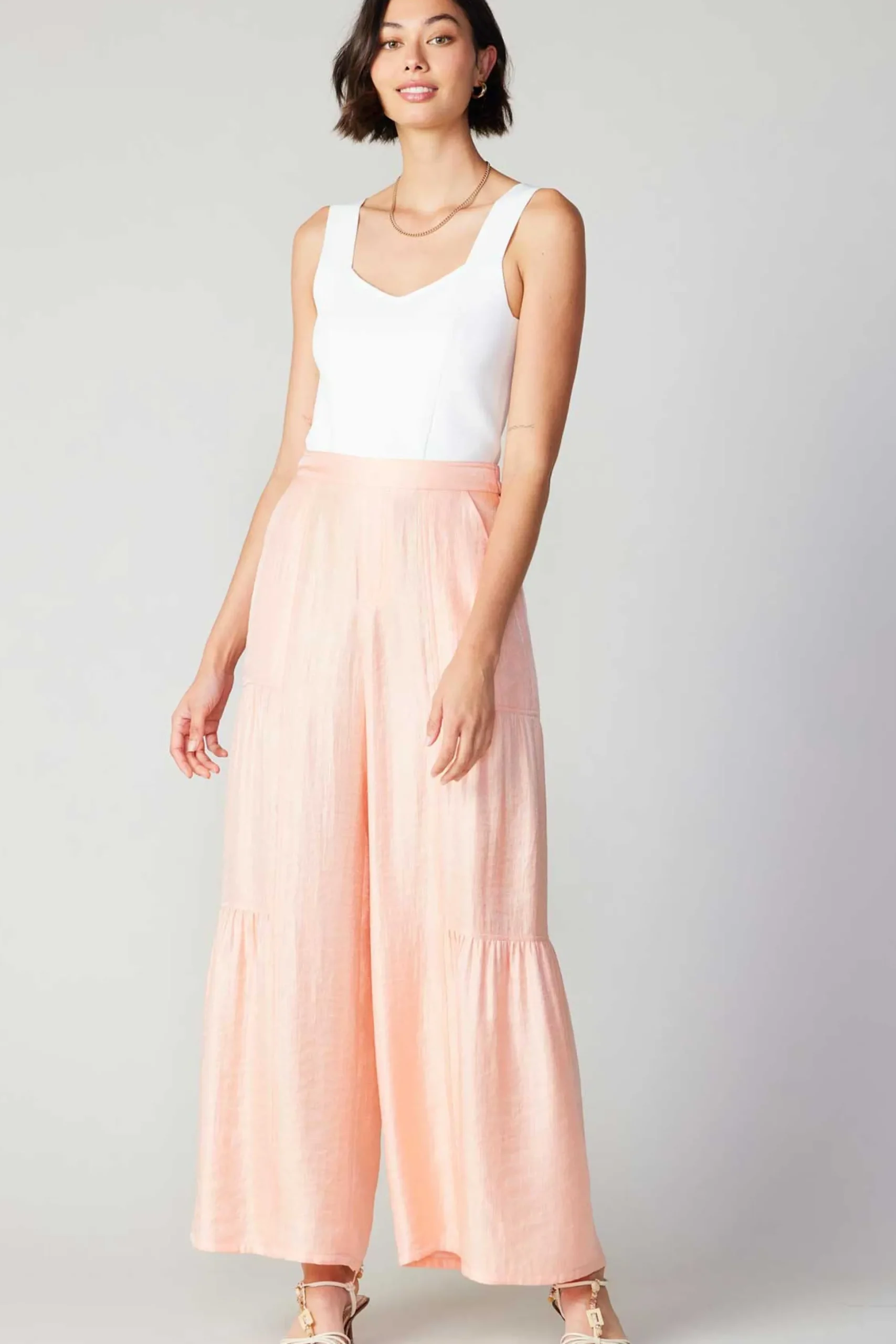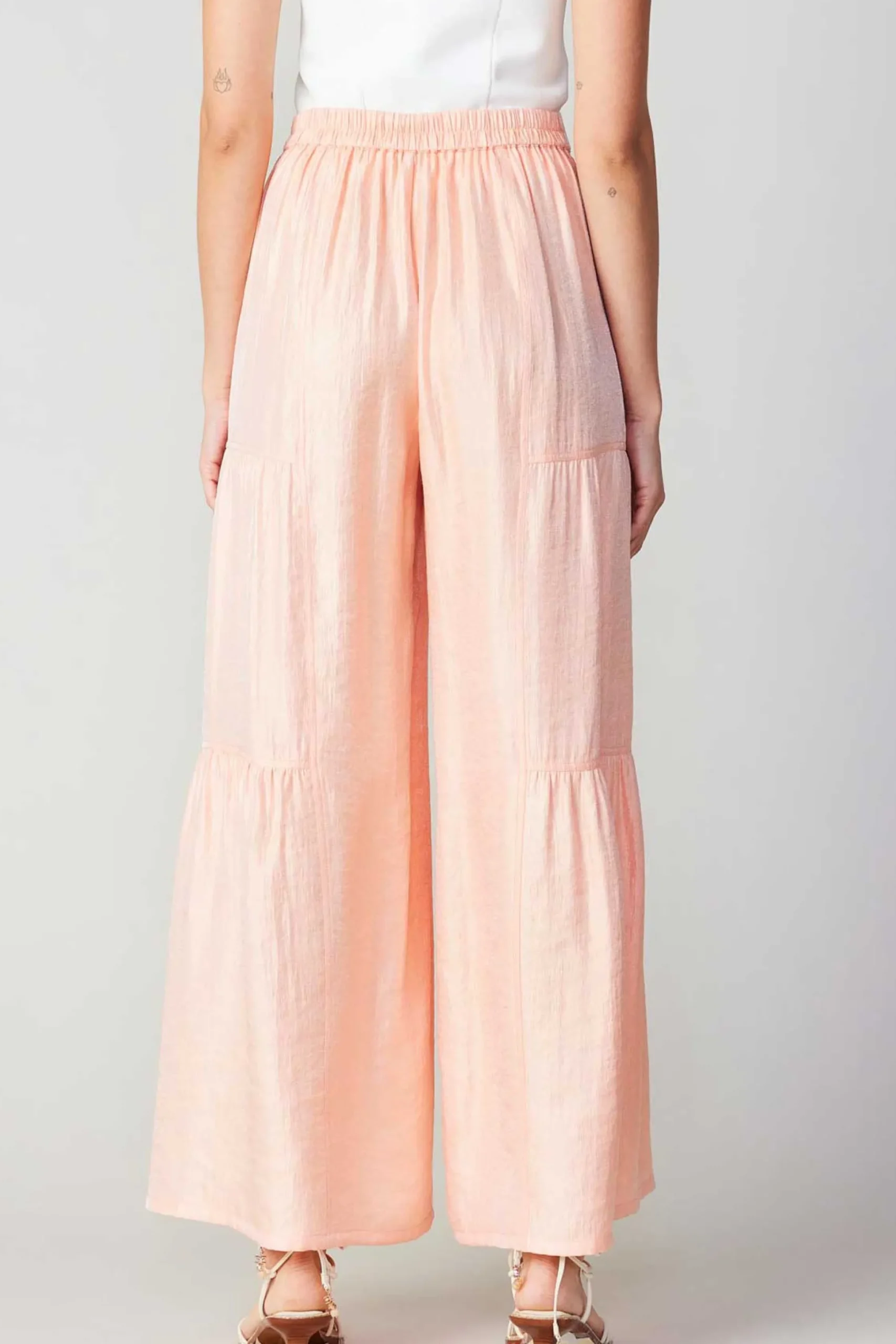 Done in a shimmery pastel, these wide-leg pants feature a voluminous silhouette with gathered tiers and a softly crinkled texture. The pull-on design has a high waist that’s elasticized at the back for a comfortable feel.