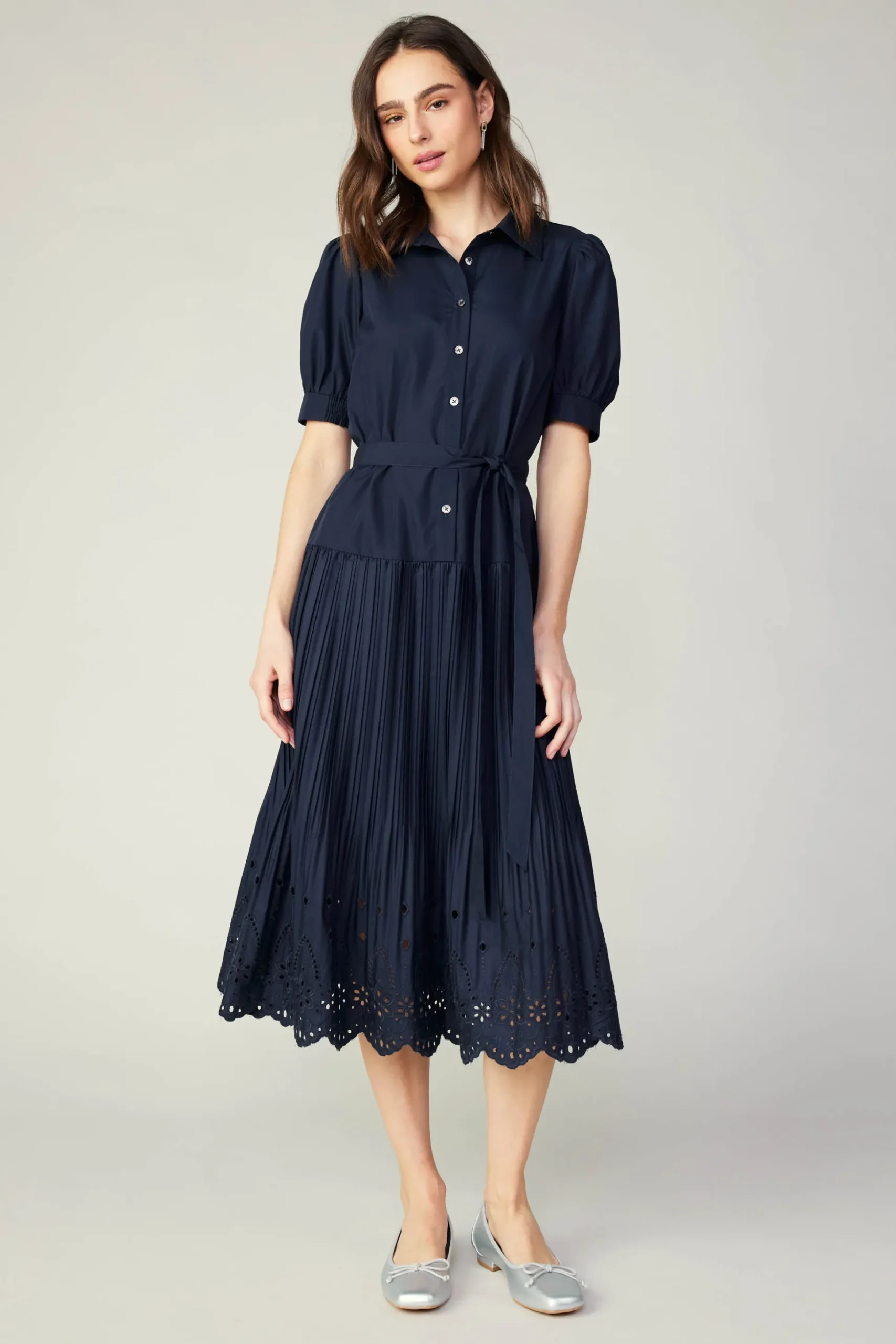 Framed by puffed sleeves, this midi dress has a pointed collar and a button-up half placket that lets you control the coverage. It’s got crisp pleats that flow to a mid-length skirt with embroidered eyelets and a scalloped hem. Wear it cinched by the matching tie belt to highlight your waist.