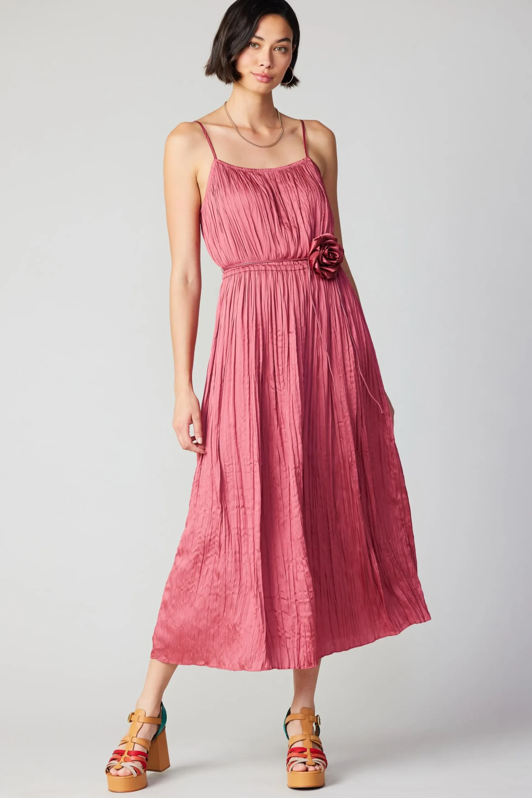 This cami dress couldn’t be more effortless. The silhouette itself is simple, but the details make it shine. Suspended by slim straps, it has gently crinkled gathers and cinches in at the waist before flowing to an ankle-sweeping hem. A tie belt adorned with a matching rosette adds the perfect finish.