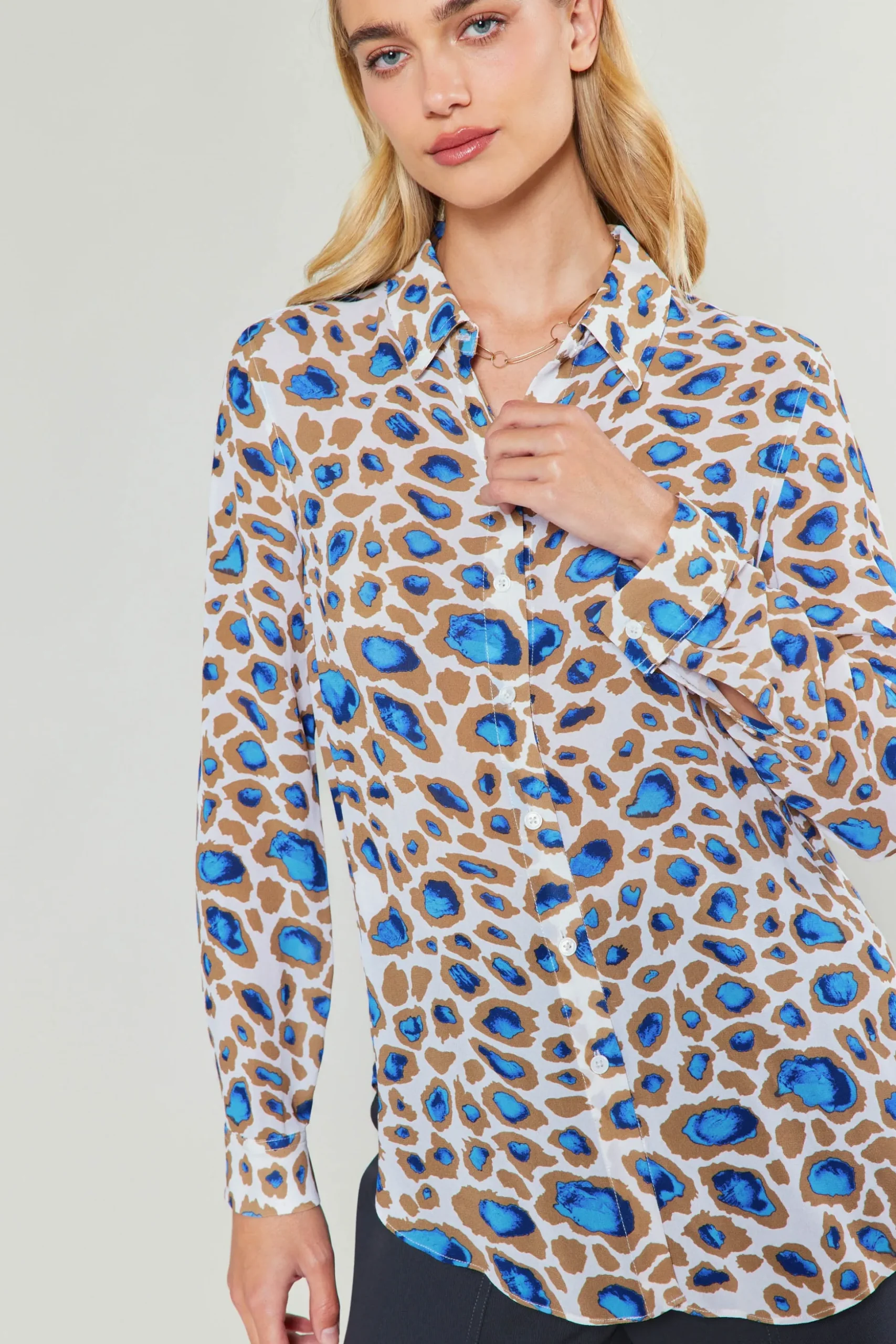 A long-sleeve buttondown shirt goes natural in a fresh take on a cenote print, blue sinkholes that dot the yucatan peninsula – It’s a statement that’s impossible to miss.