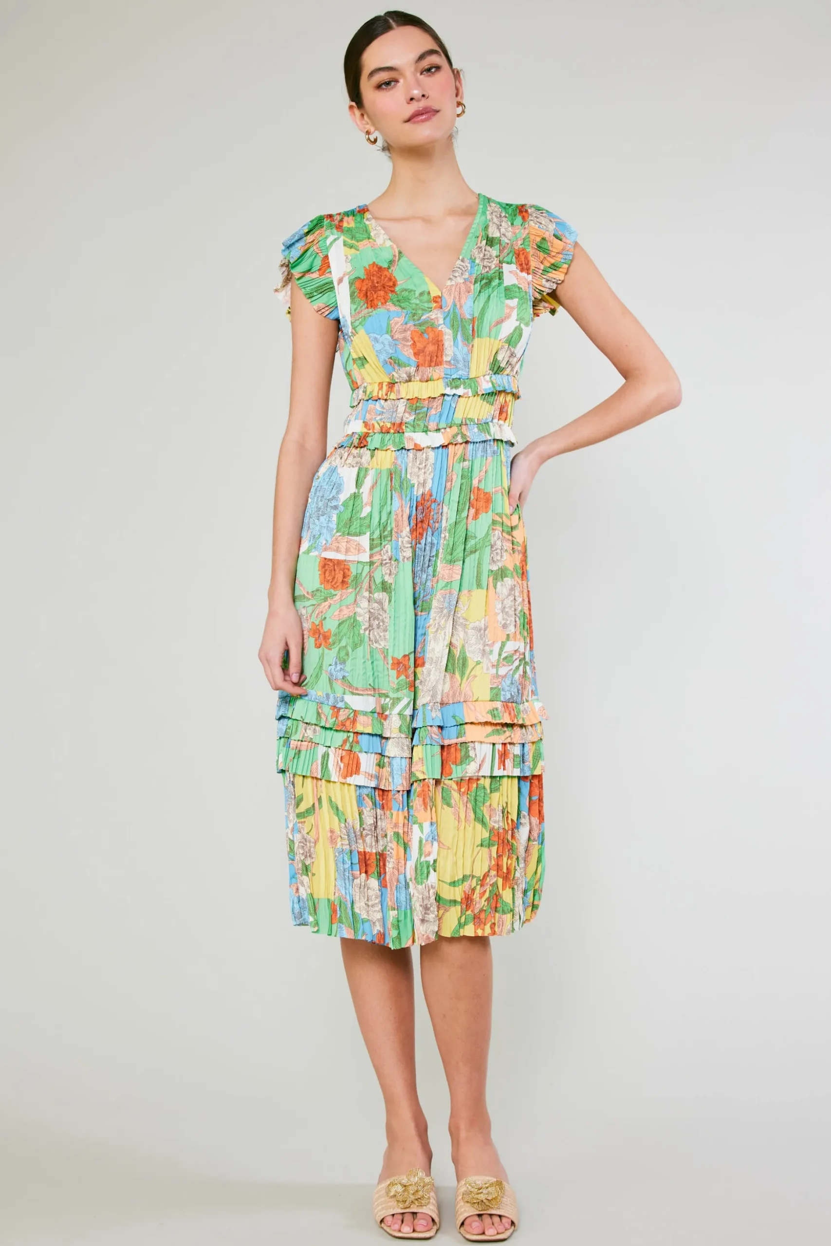 Allover pleating, fluttery cap sleeves, and sweet ruffle accents deliver a decidedly feminine look to this V-neck midi dress in a new stunning floral color block pattern.