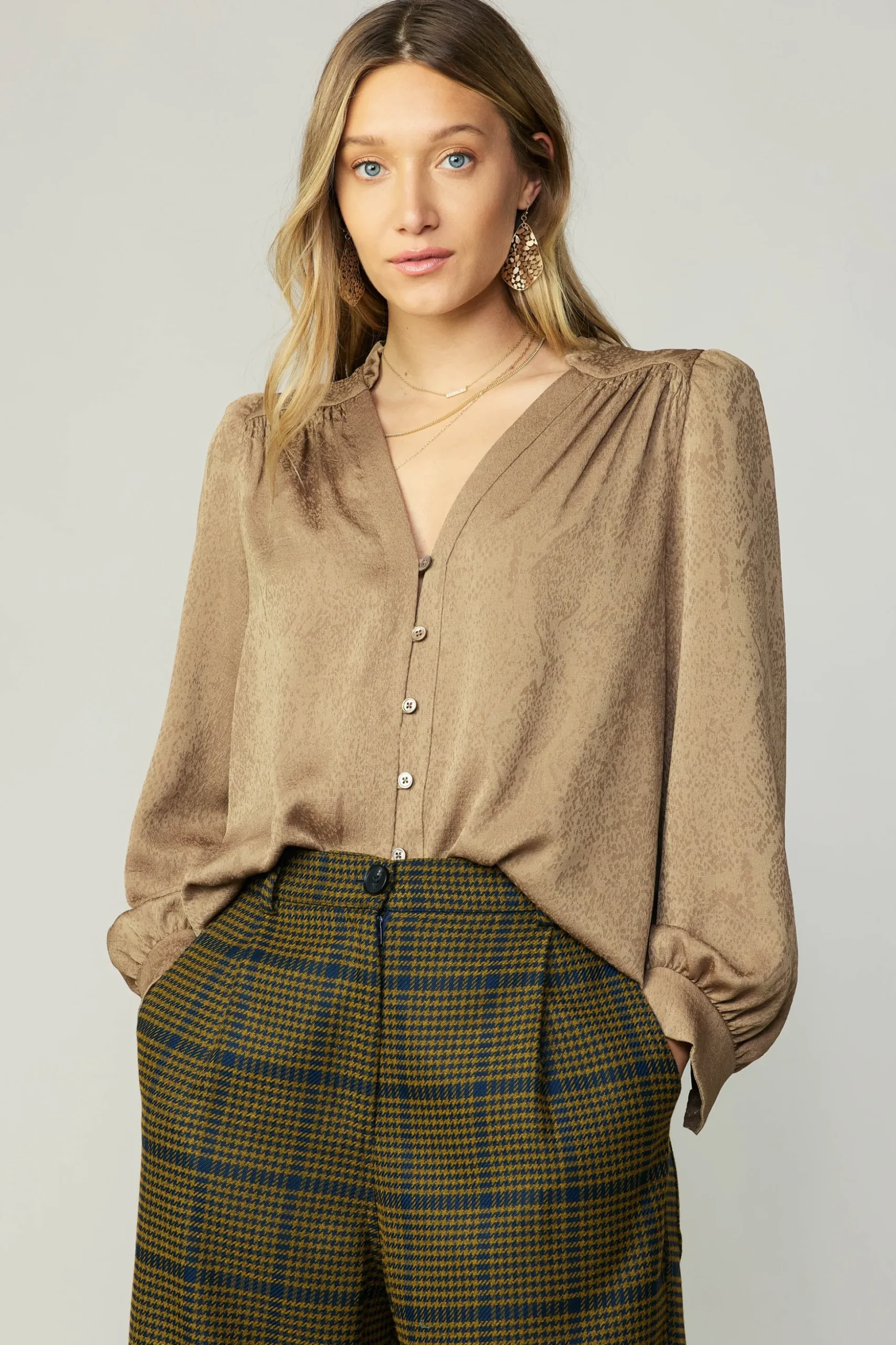 Delicate shirring at the shoulders add an effortlessly romantic touch to a silhouette with a split neckline, button placket, and long, slightly puffed sleeves – All crafted from a lovely mini leopard print jacquard fabric.