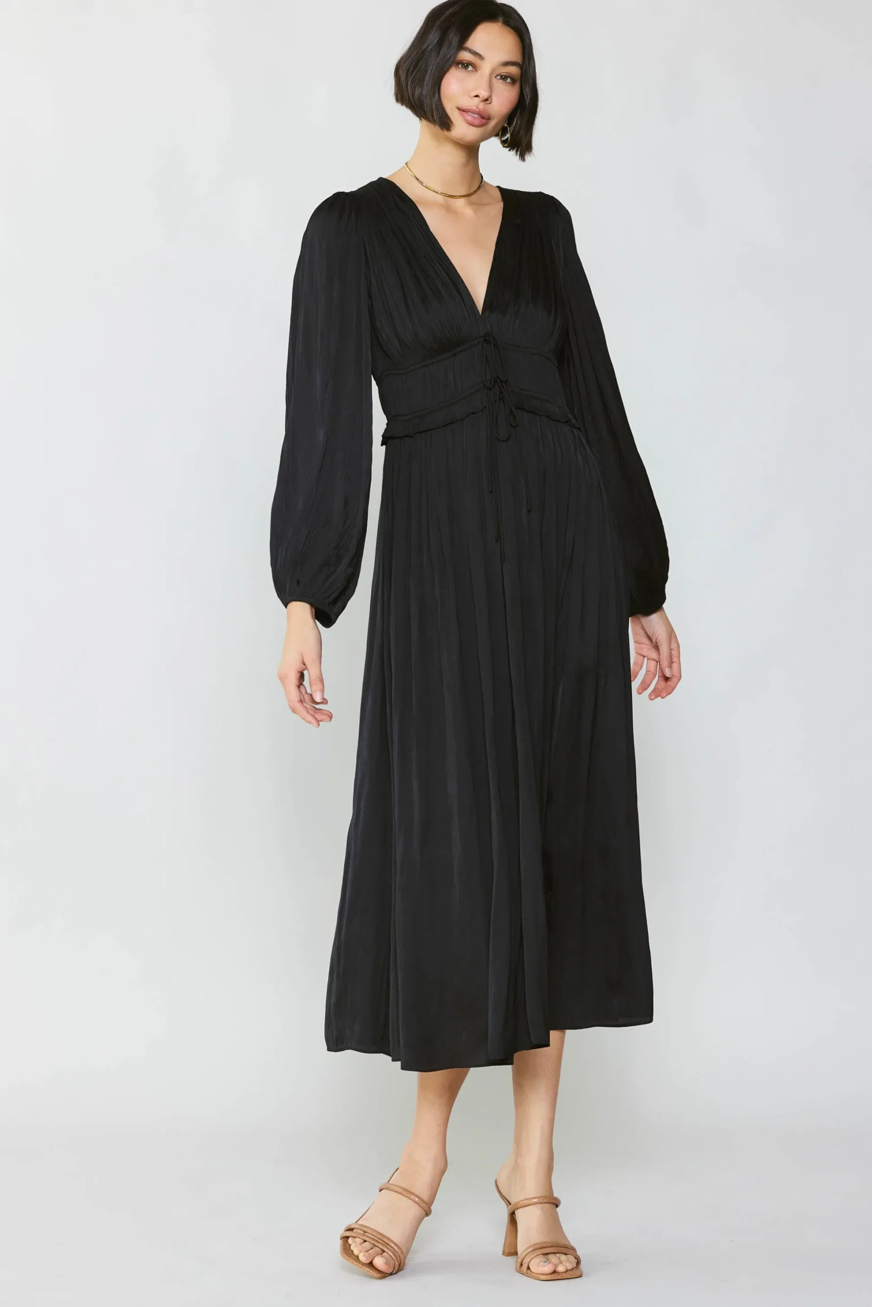 An ethereal long-sleeve dress fit for a modern goddess. With a plunging neckline and delicate pleated top that ties at the center, it’s truly a stunner.
