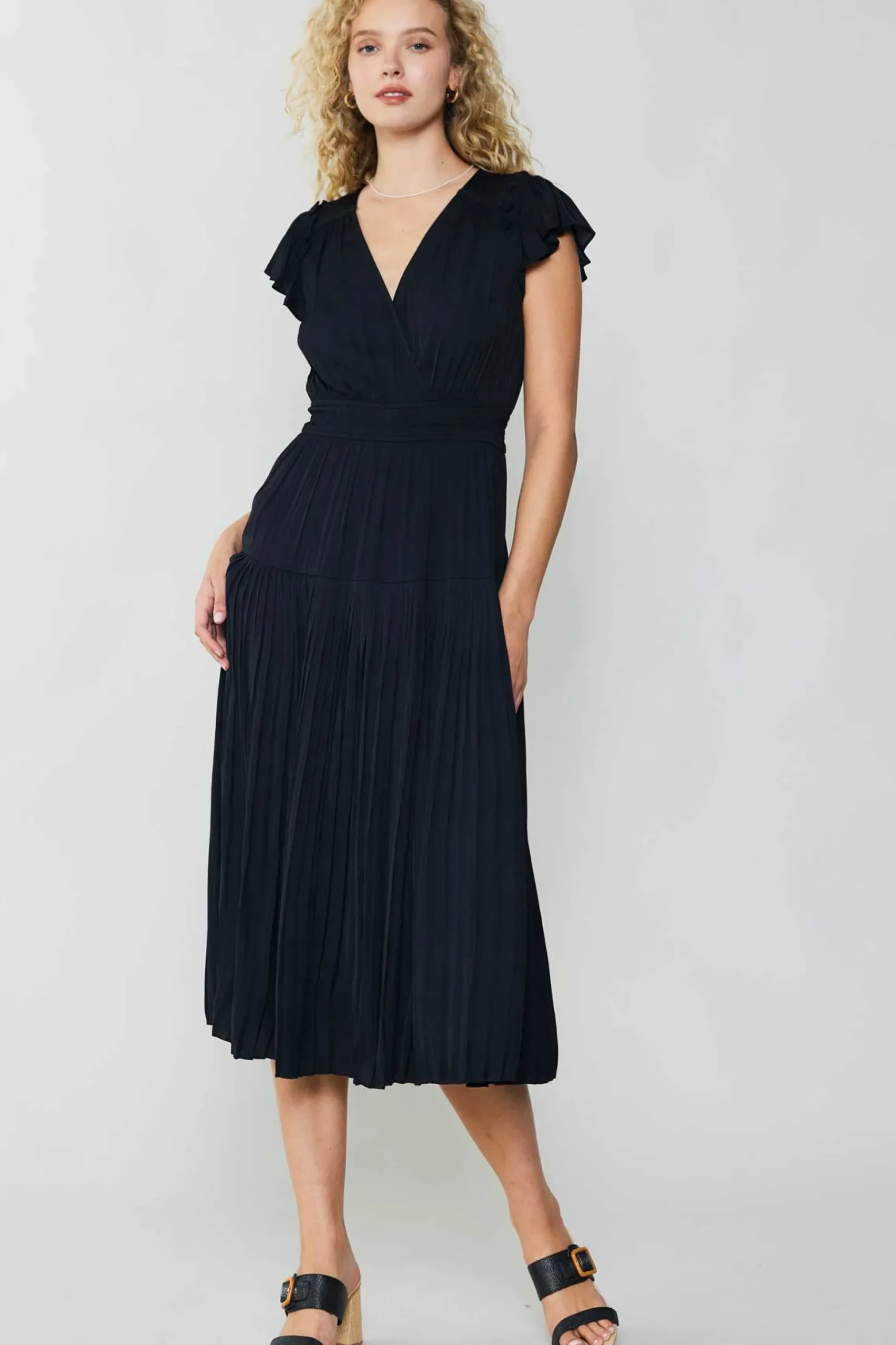 Accented with flutter sleeves, this v neck dress exudes a distinctly feminine charm. It has an elasticized waist for a comfy fit.