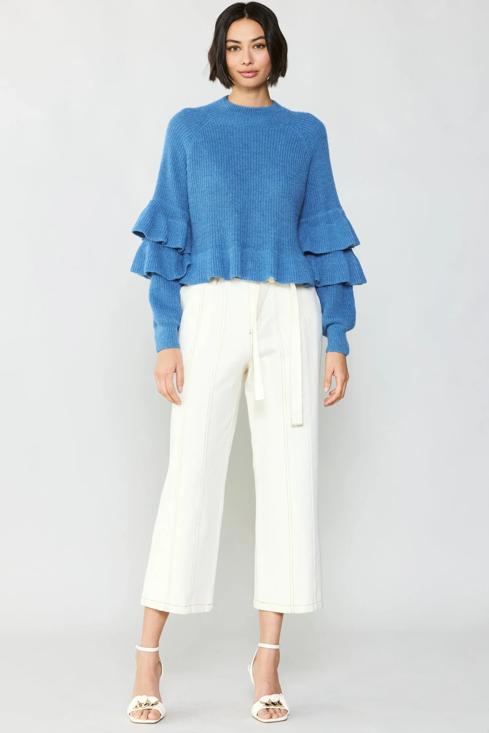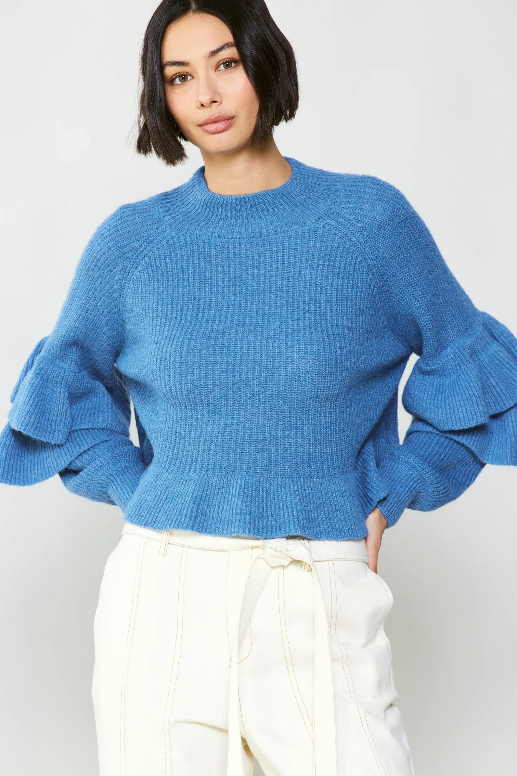 This striped sweater with ruffled sleeves will be the standout of your knitwear collection. The mockneck style has a relaxed, slightly boxy silhouette finished by a ruffled hem.