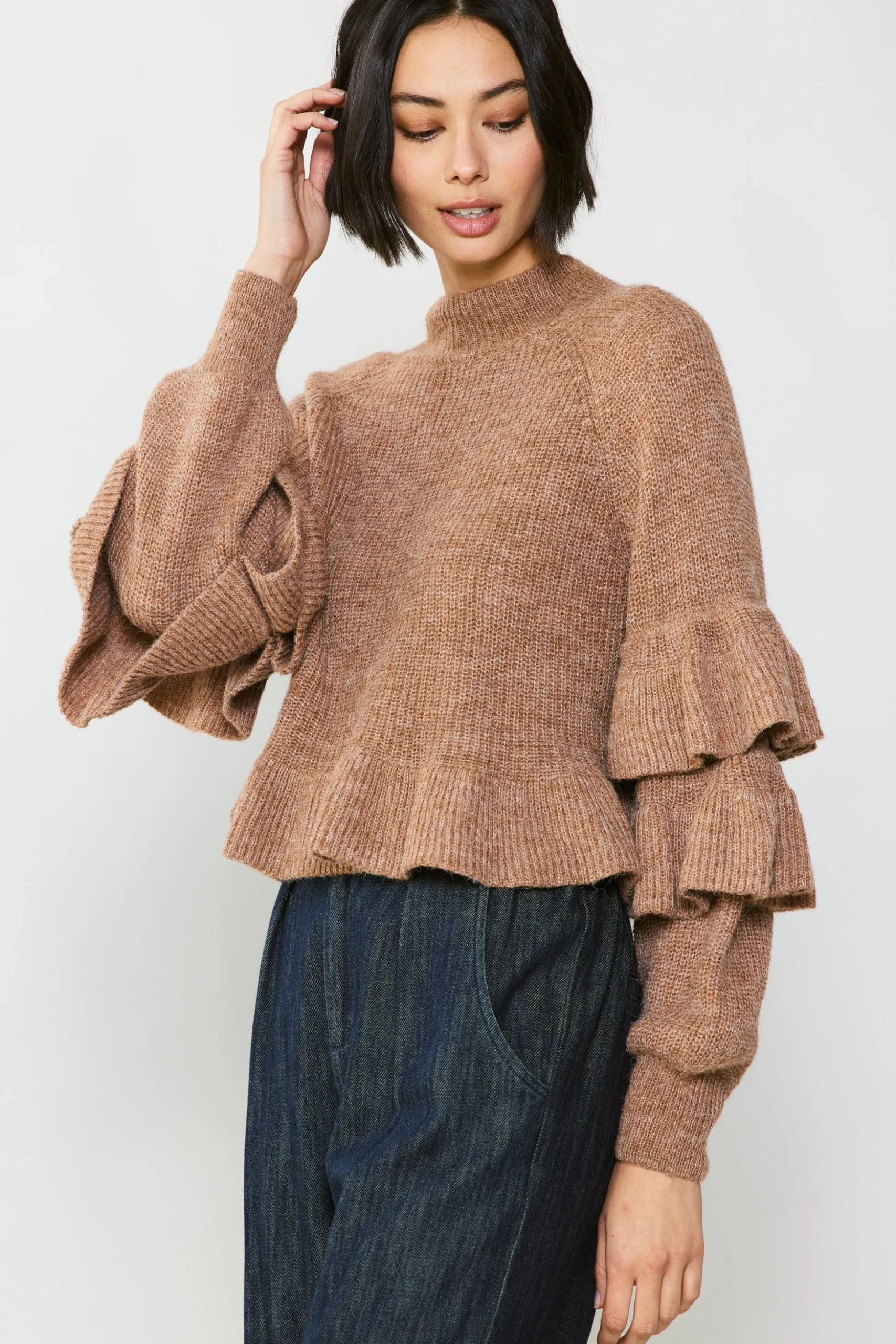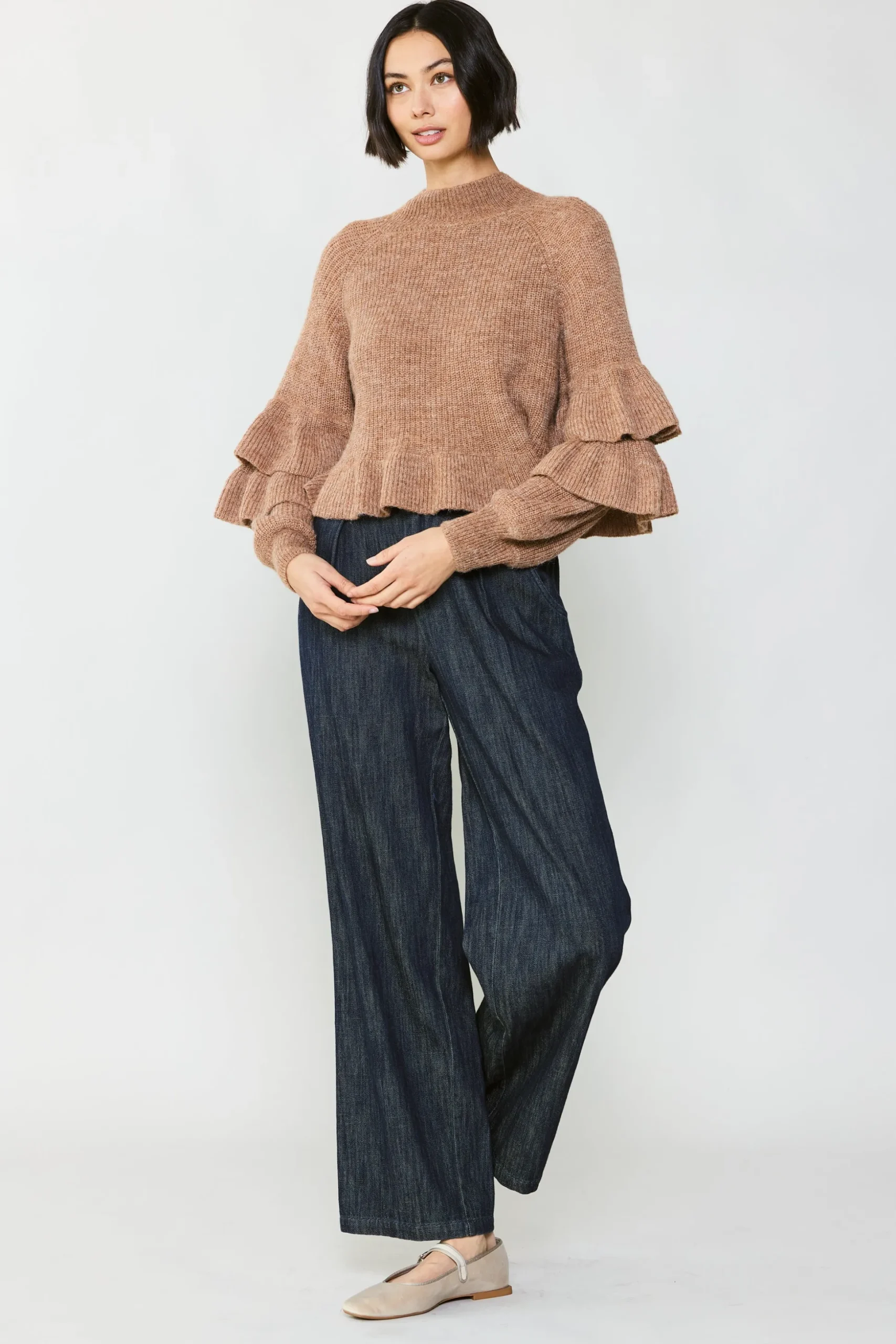 This striped sweater with ruffled sleeves will be the standout of your knitwear collection. The mockneck style has a relaxed, slightly boxy silhouette finished by a ruffled hem.