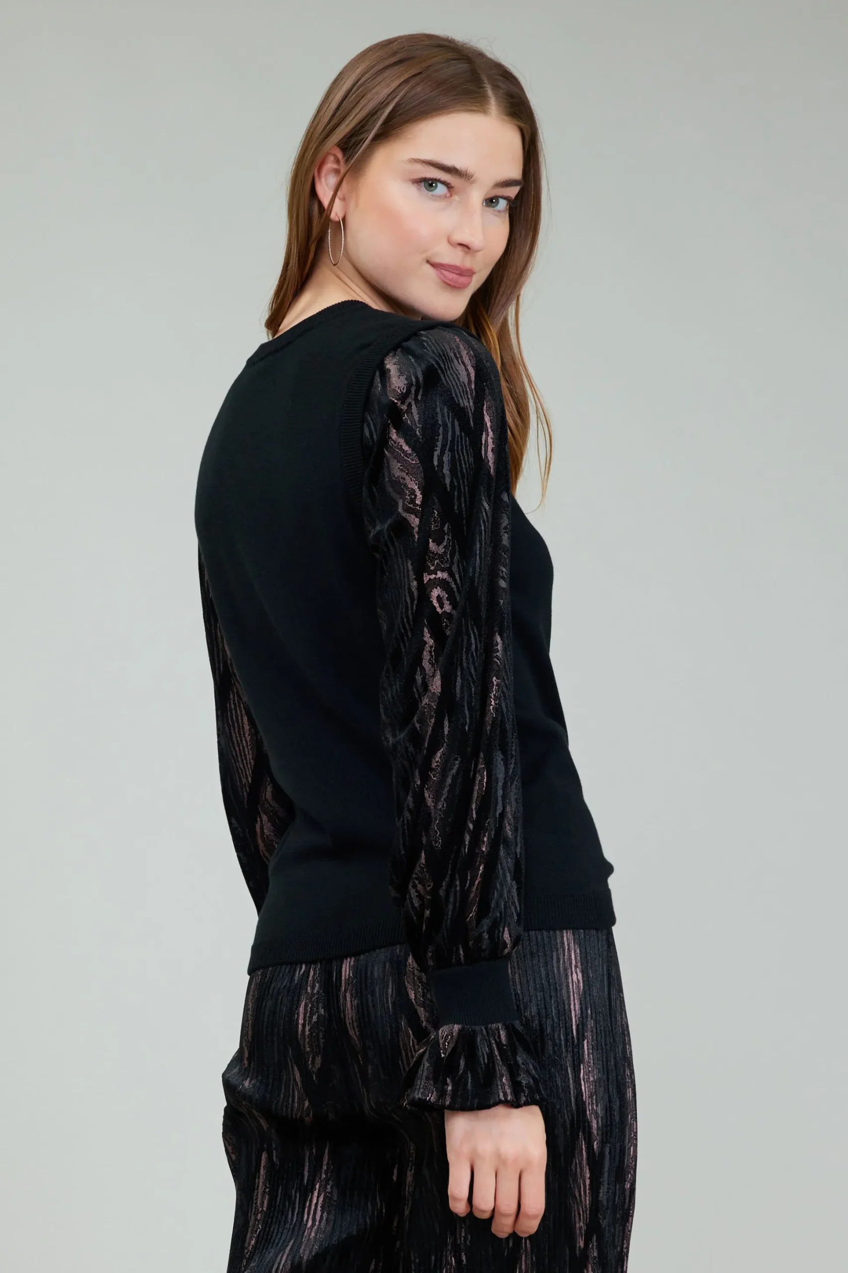 fine-gauge sweater combined with metallic shine brings a playful spark to your everyday wardrobe. Bonus points for the ruffled cuffs.